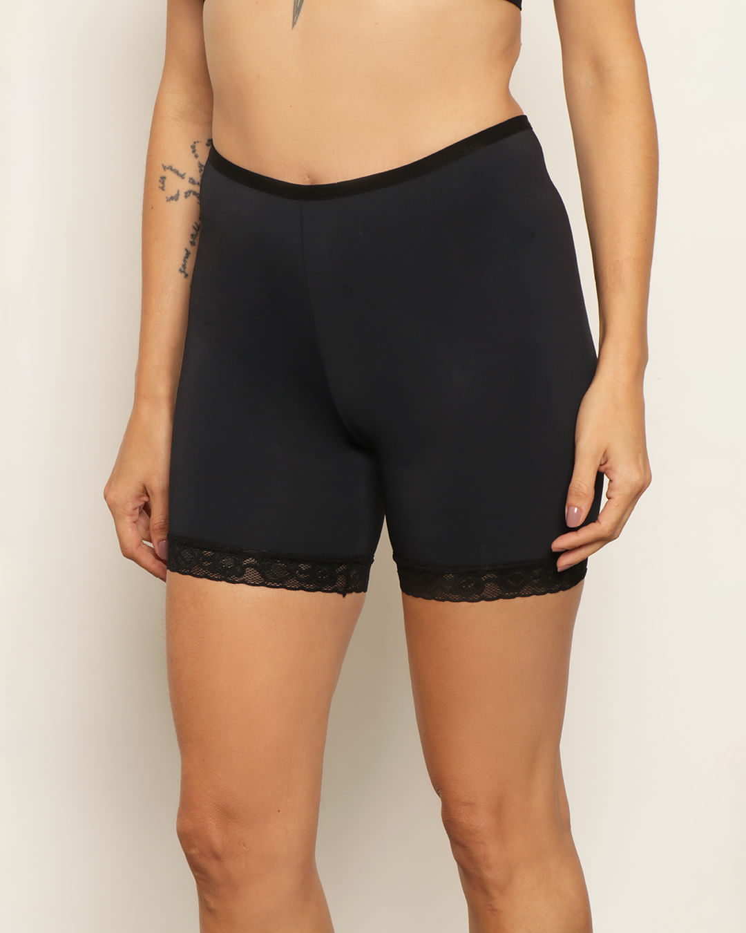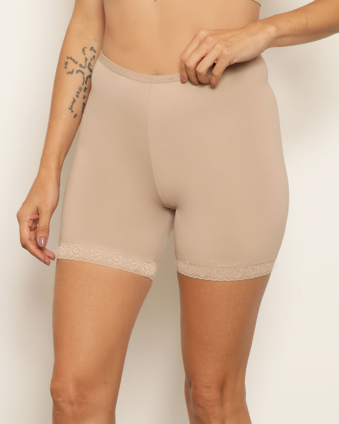 Bermuda feminina segunda pele, confeccionada em tecido de poliamida. Possui modelagem confortável, Esta peça é perfeita, pois sua modelagem se ajusta bem ao corpo e garante o conforto ideal durante o uso. Barra com renda. Acabamento e costura padrão.