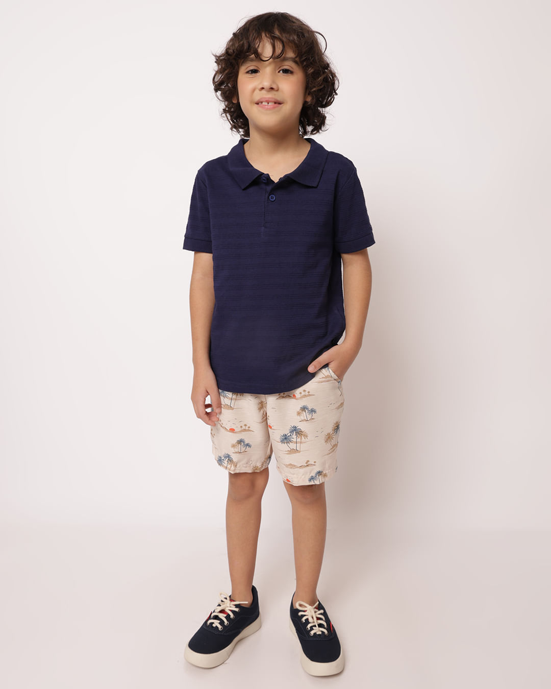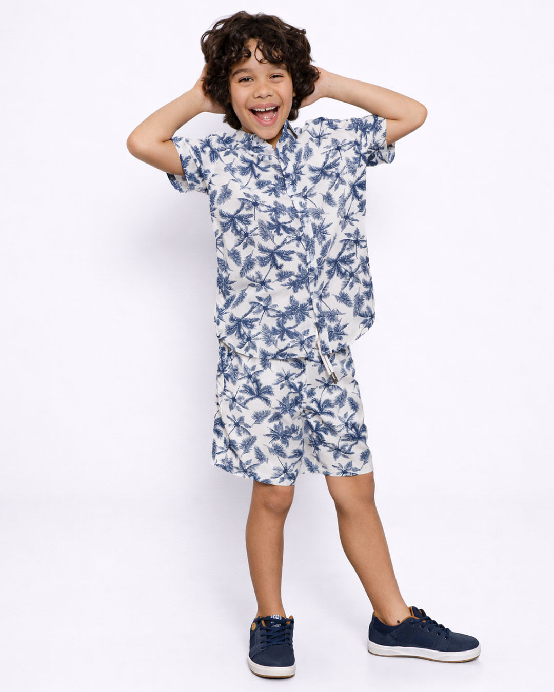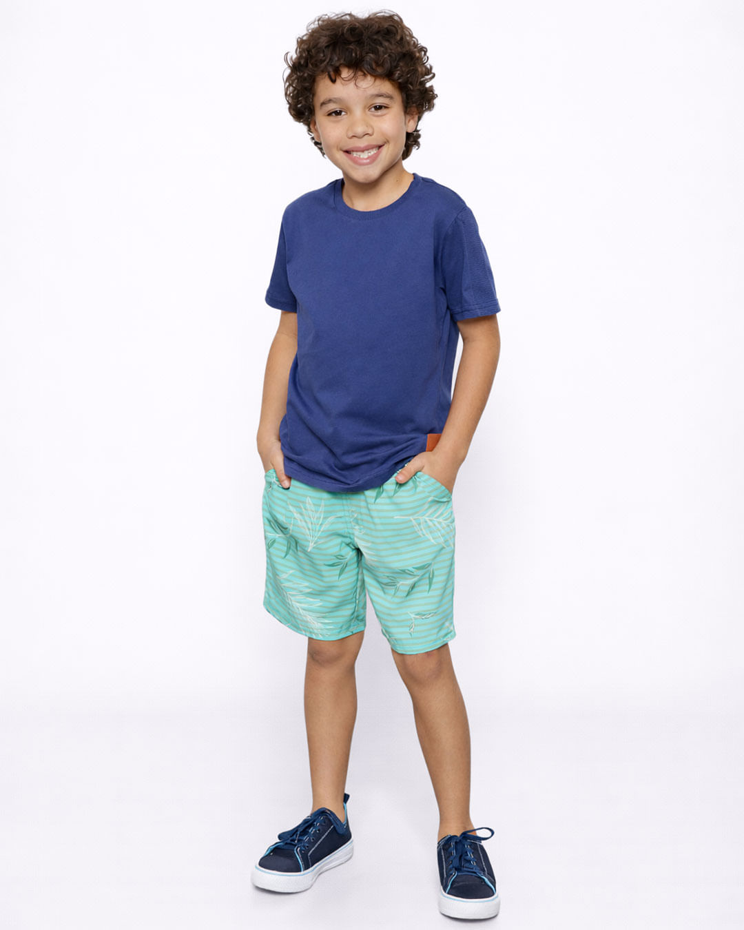 Bermuda infantil confeccionada em poliéster. Possui modelagem reta, cós com elástico, cordão de ajuste, estampa tropical e barra comum com costura e acabamento padrão.