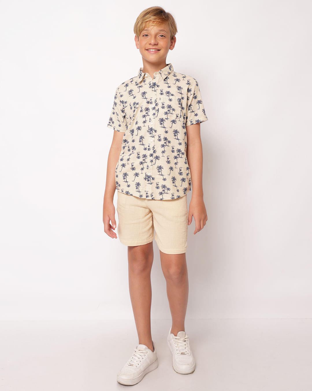 Bermuda juvenil confeccionada em algodão gaze, possui cós regular com elástico e cordão de ajuste, modelagem reta, bolsos frontais e barra comum com costura e acabamento padrão.