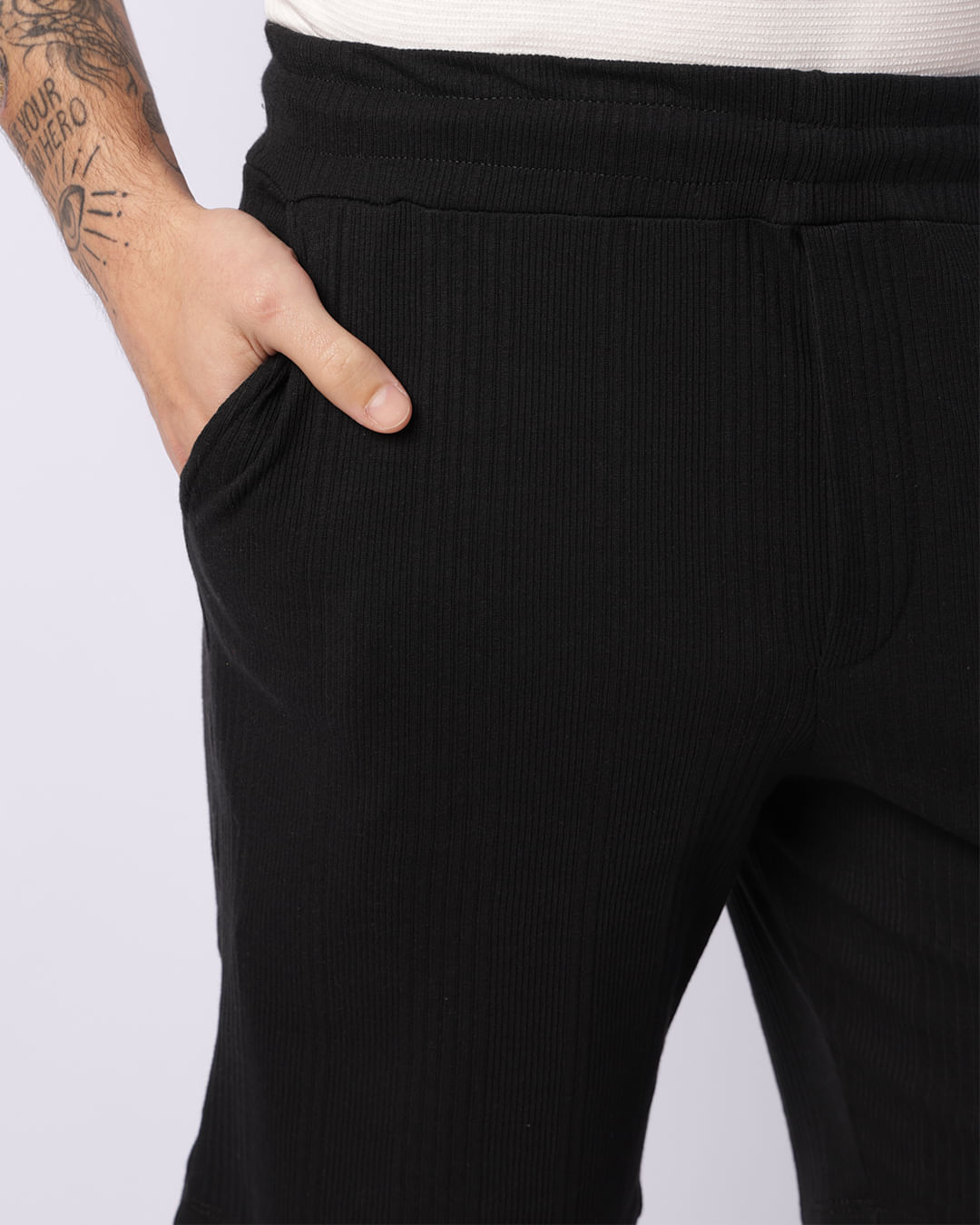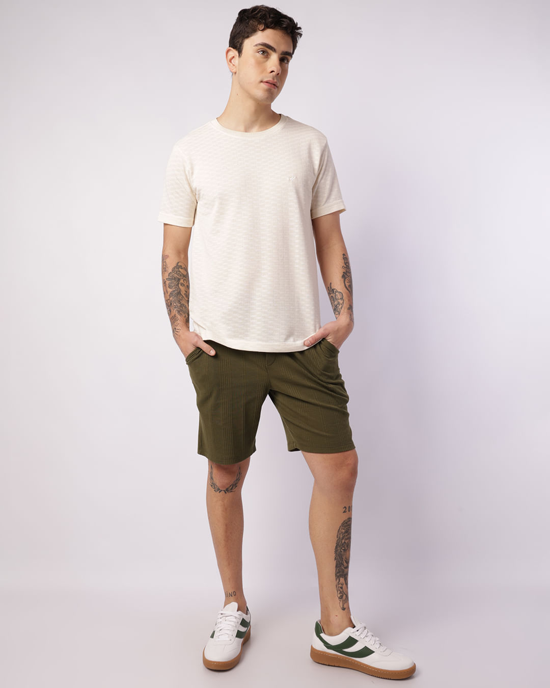 Mais detalhes: Bermuda masculina possui modelagem reta, cós regular elástico com cordão de ajuste, bolsos frontais e barra comum, peça texturizada com costura e acabamento padrão.