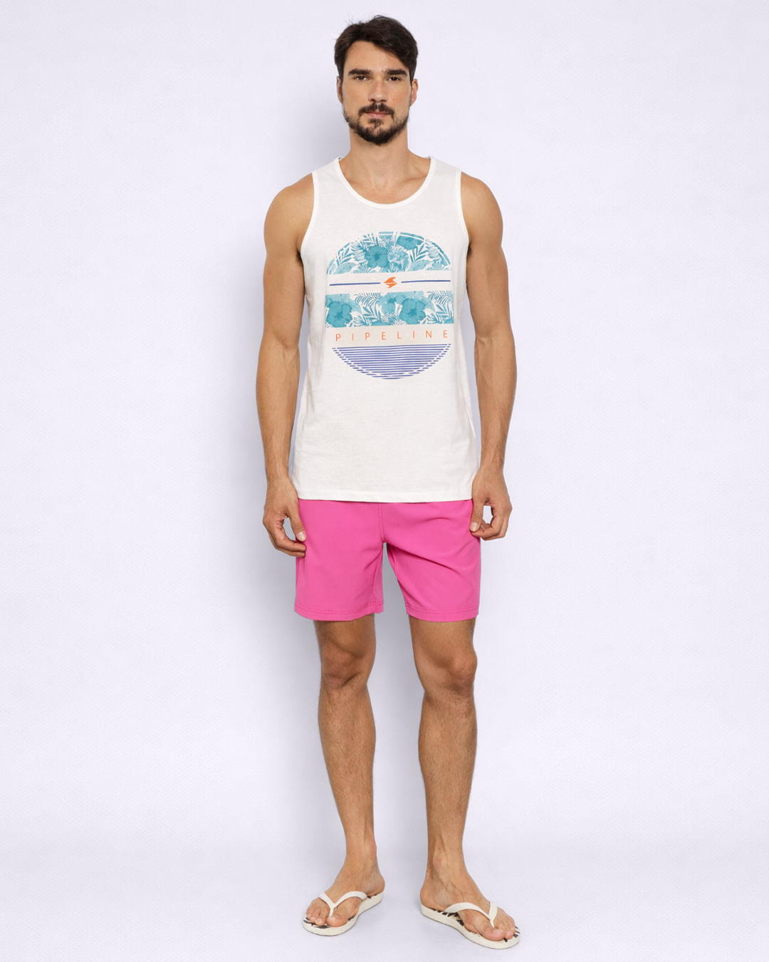 Bermuda masculina confeccionada em poliéster. Possui cós com elástico e cordão ajuste, modelagem reta, bolsos frontais e único posterior, barra simples com acabamento e costura padrão.