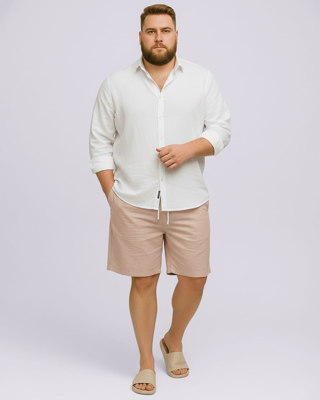 Mais detalhes: Bermuda plus size masculina, confeccionada em viscolinho. Possui modelagem reta, com bolsos frontais e um único posterior. Peça com cós com elástico e cordão de ajuste. Costura e acabamento padrão;)