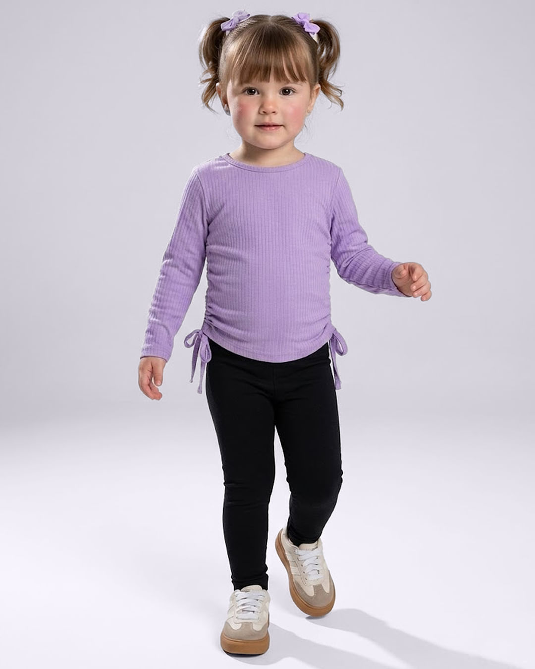 Mais detalhes: Blusa bebê confeccionada em poliéster, tecido canelado, decote redondo, manga longa, colissê na parte lateral, com costura e acabamento padrão.