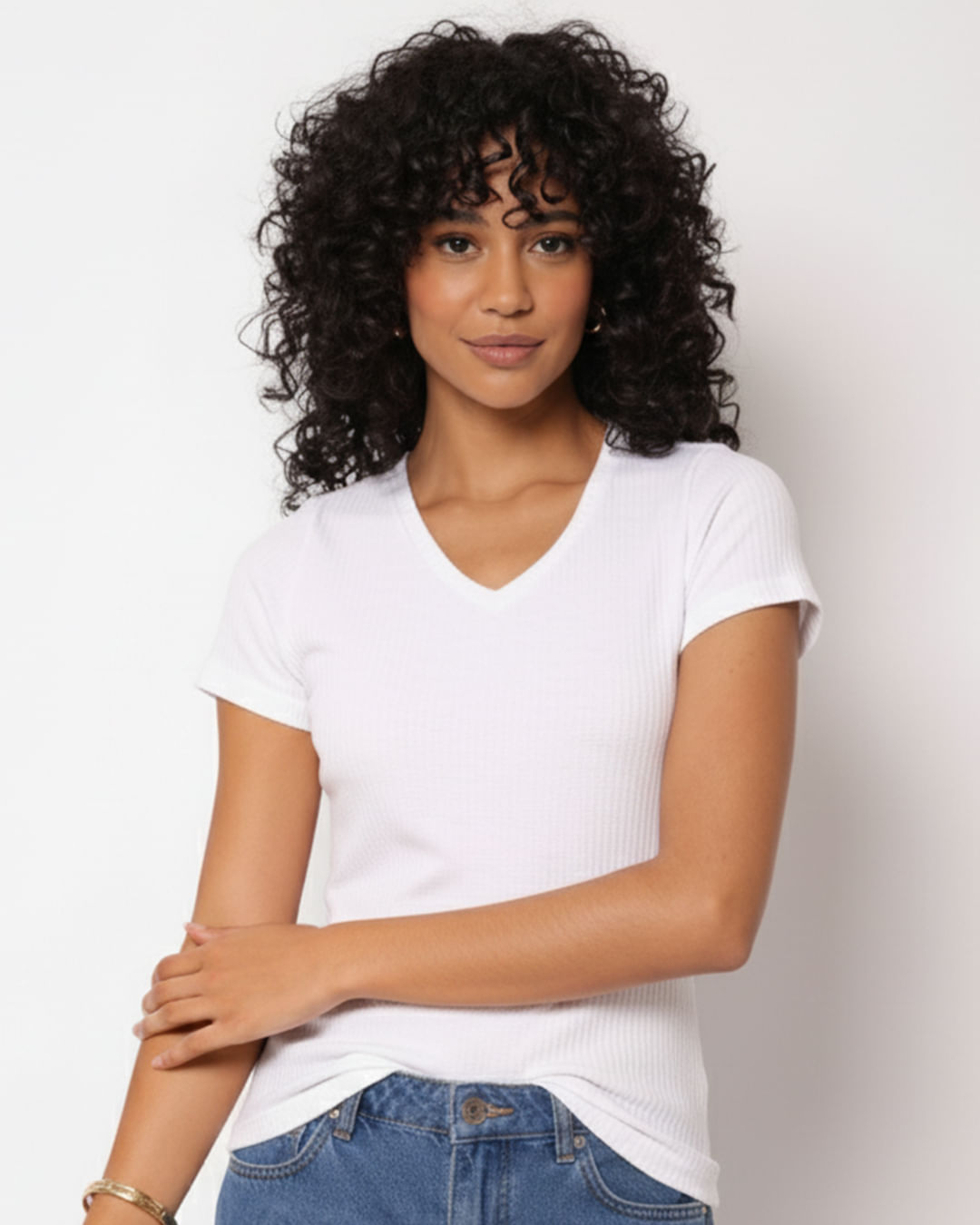 Mais detalhes: Camiseta feminina básica canelada, confeccionada em poliéster, decote v com manga curta, modelagem padrão, com costura e acabamento padrão.