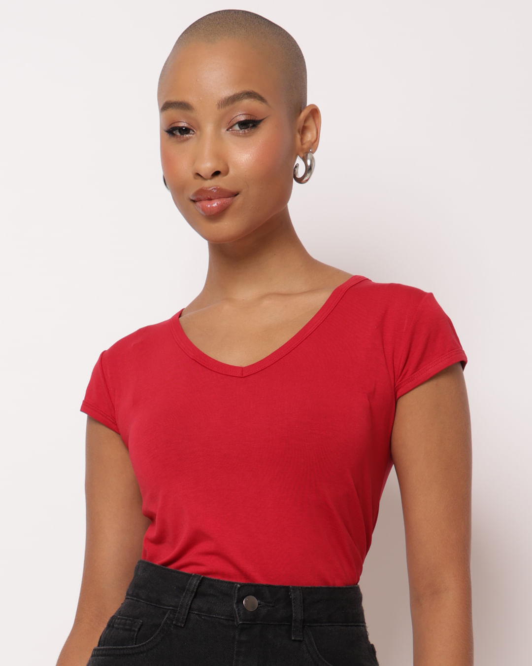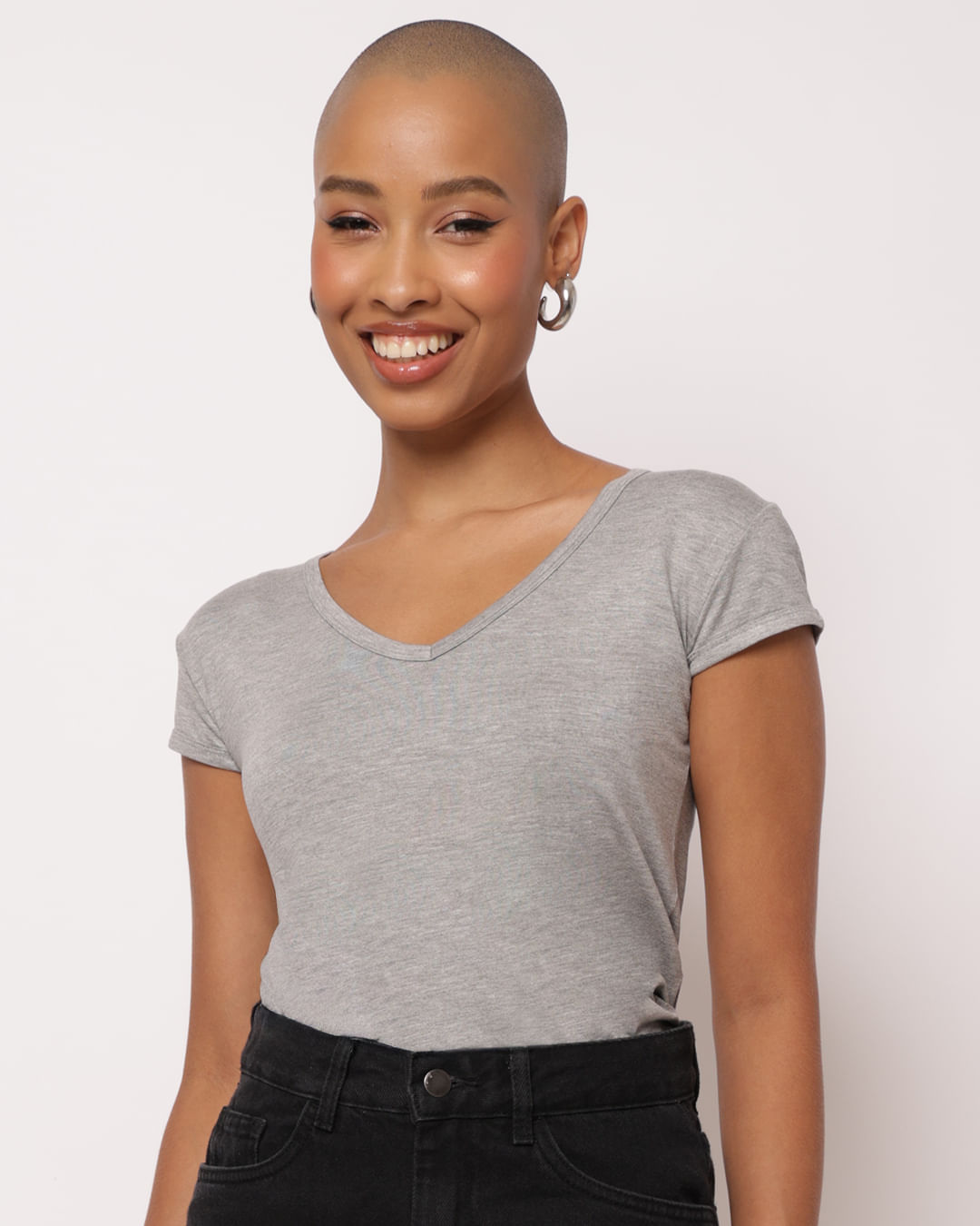 Blusa feminina confeccionada em malha de viscose. Possui modelagem reta, gola em V, manga curta copinho. Com acabamento e costura padrão.