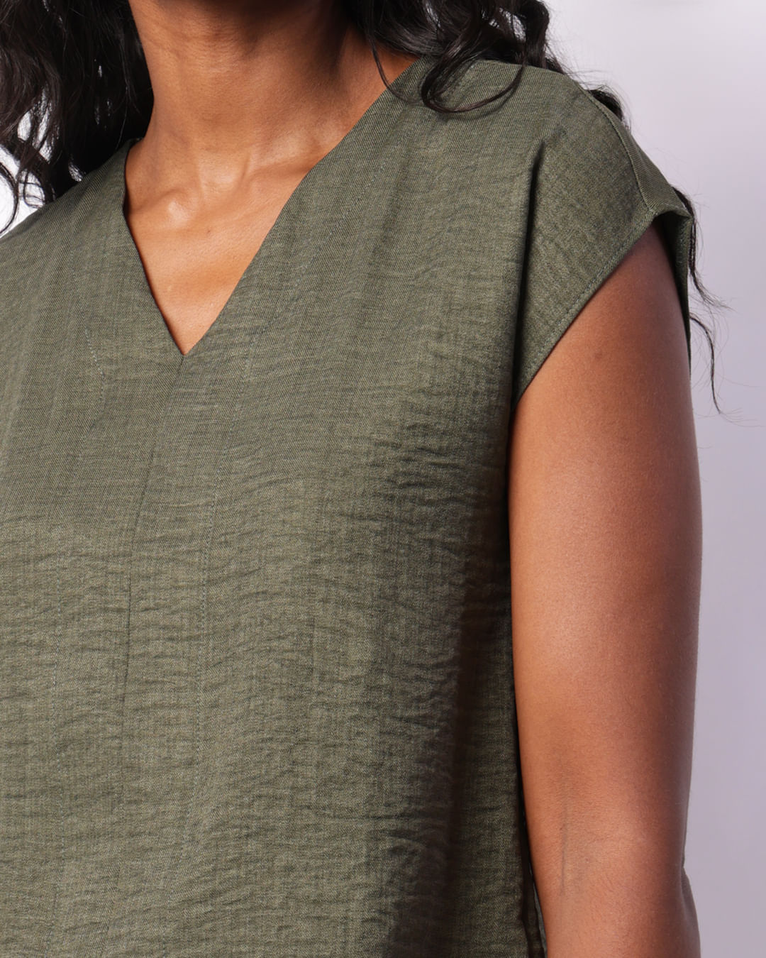 Mais detalhes: Blusa feminina, confeccionada em poliéster, decote V, manga curta, leve texturas, com costura e acabamento padrão.
