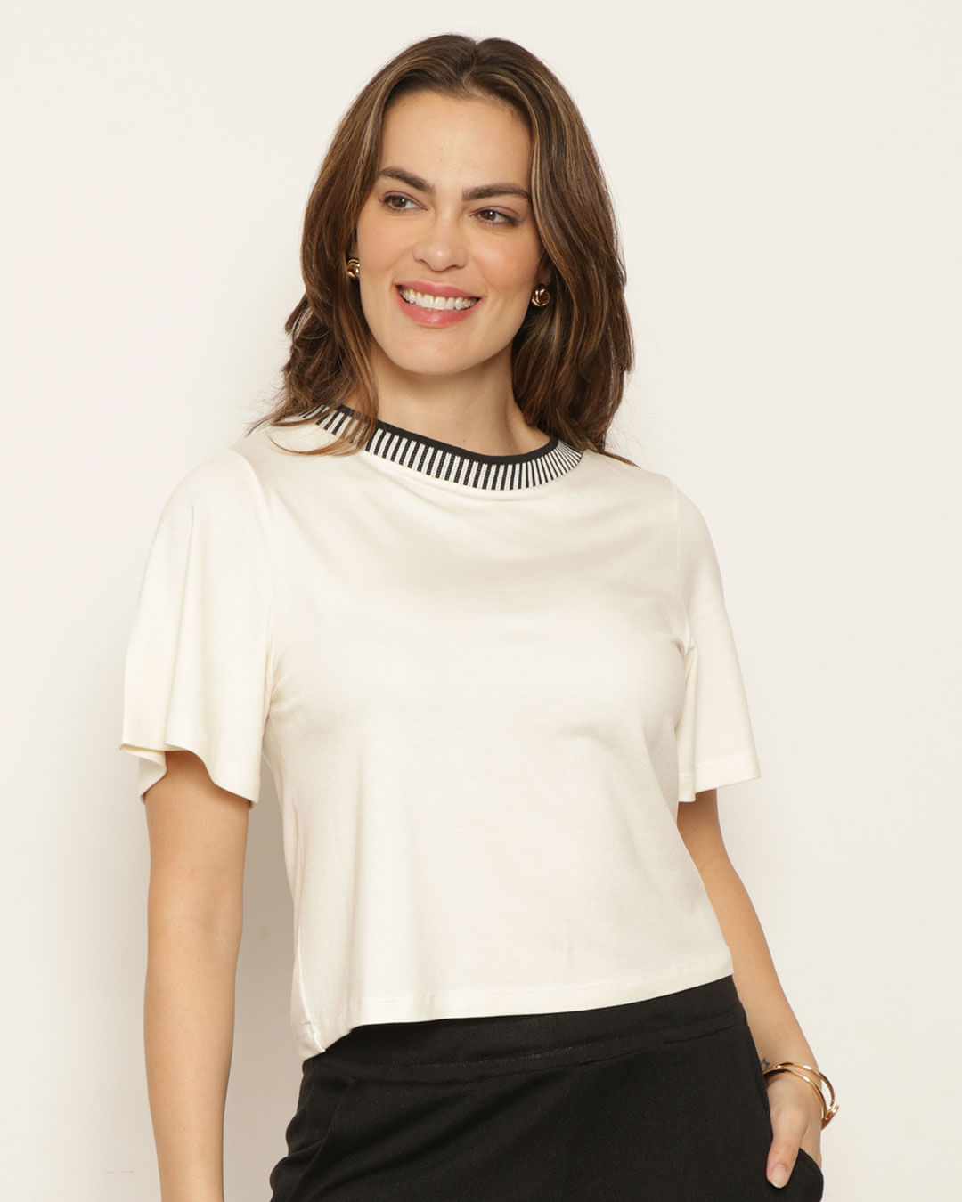 Blusa feminina confeccionada em tecido malha. Possui gola redonda, manga curta, modelagem padrão, gola em tricô, barra comum, com acabamento e costura padrão.