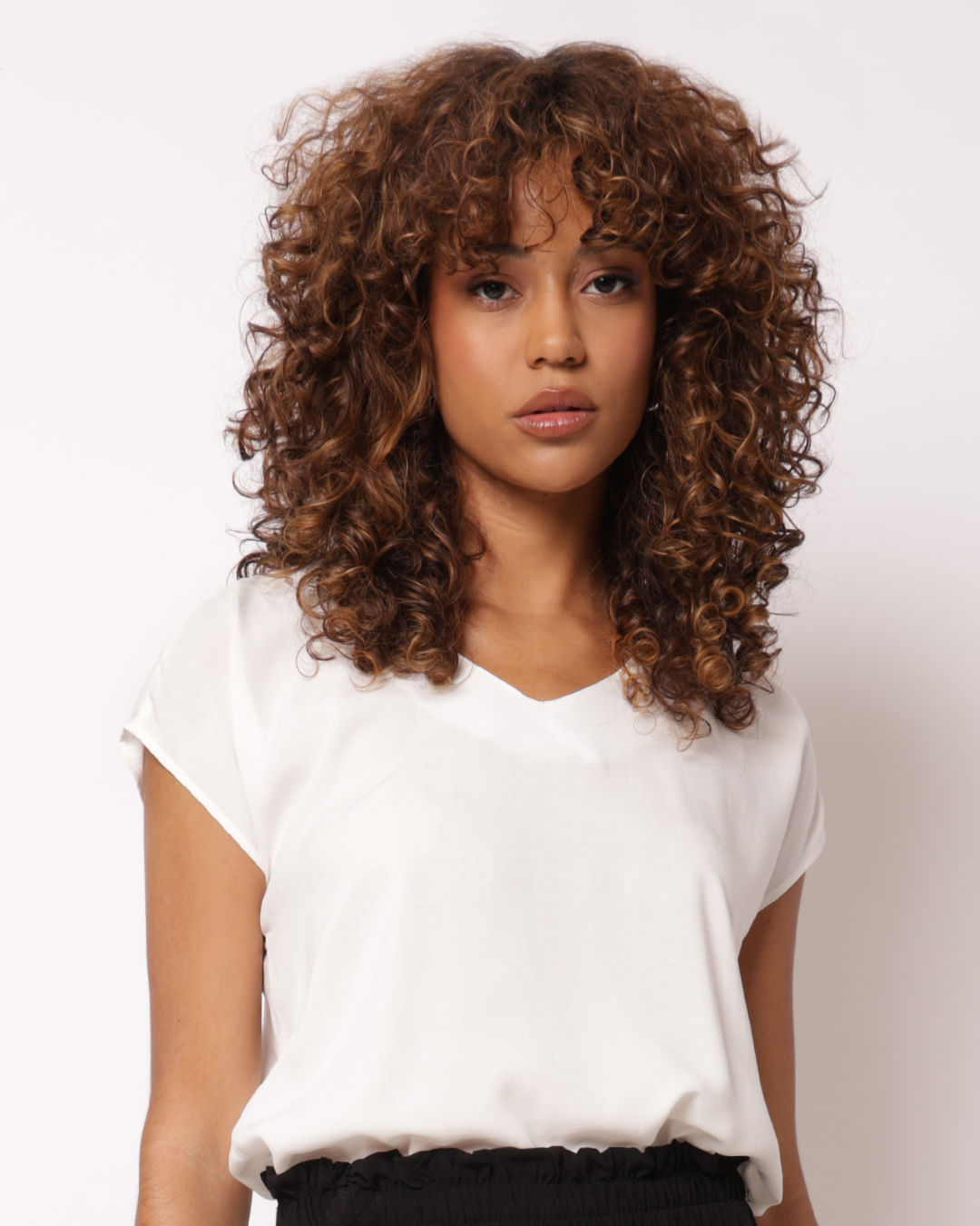 Blusa confeccionada em malha de viscose. Possui gola V, manga morcego, e barra com acabamento padrão.