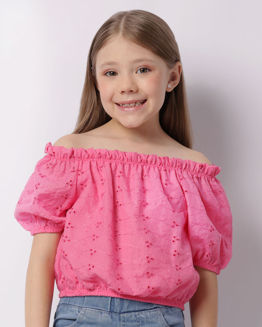 Mais detalhes: Blusa infantil confeccionada em laise, modelagem cropped ciganinha, manga curta, elástico no decote, mangas e na barra. Com forro na parte frontal. Com costura e acabamento padrão.