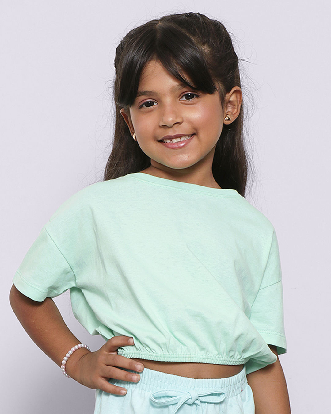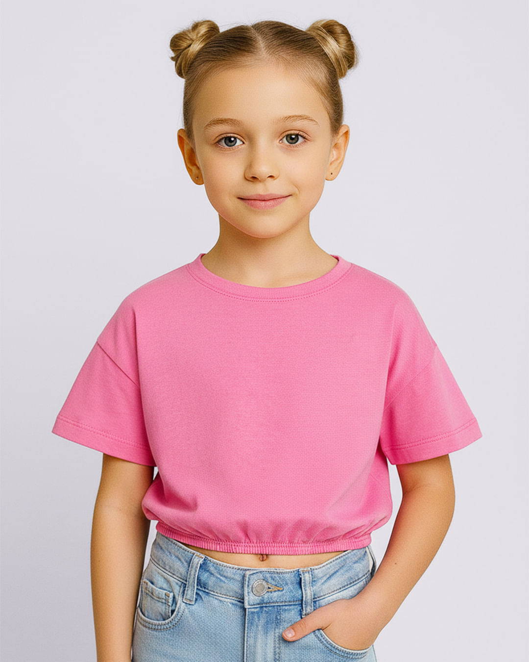Blusa infantil Cropped confeccionada em algodão. Possui modelagem cropped, manga curta, barra com elástico. Acabamento e costura no tom.