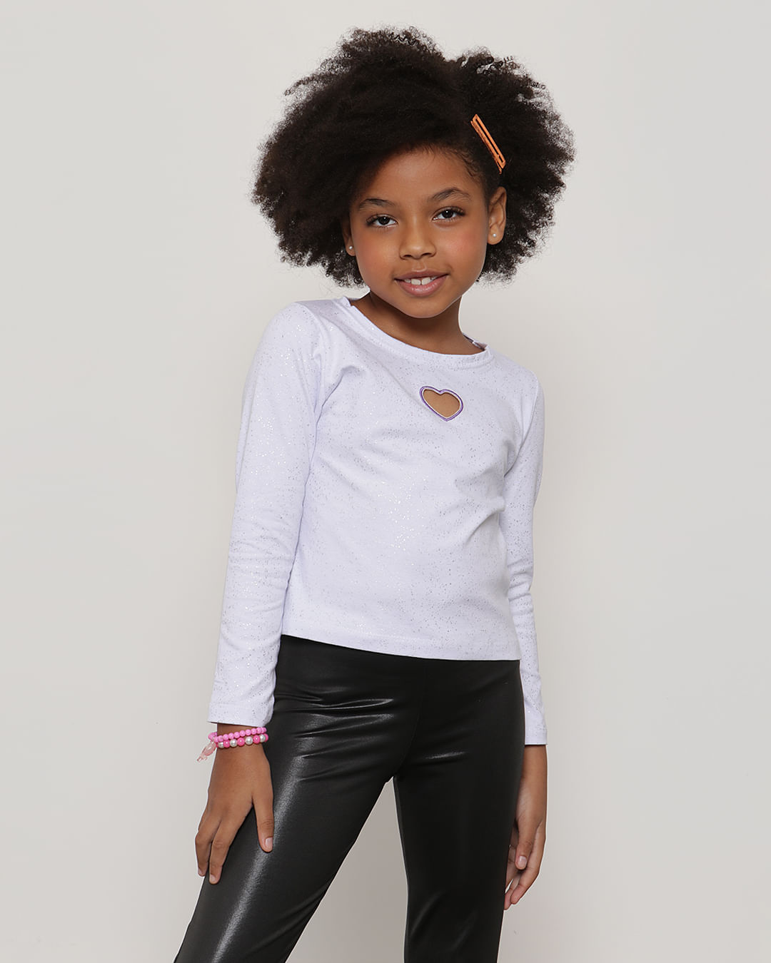 Blusa infantil confeccionada em malha de algodão. Possui decote redondo, manga longa, bordado frontal vazado em formato de coração, tecido todo estampado com pontos de Foil prata, barras simples e acabamento no tom. Ideal para deixar sua princesa super linda e confortável.