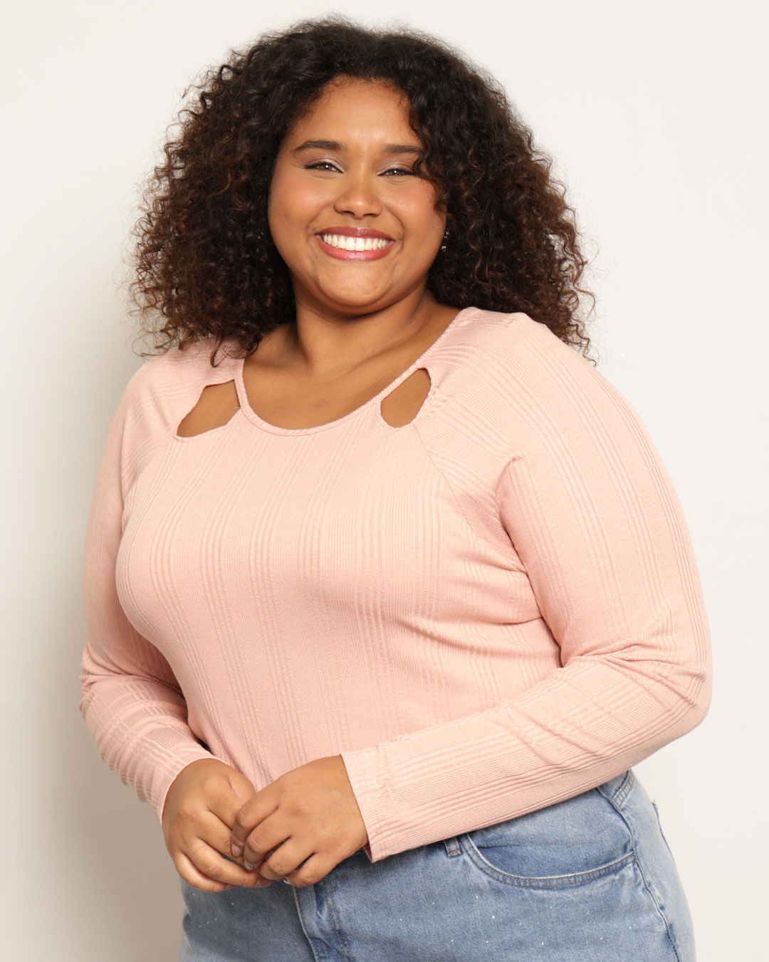 Blusa plus size feminina confeccionada em malha canelada. modelagem manga curta, decote redondo com recorte vazado no decote. Com costura e acabamento padrão.
