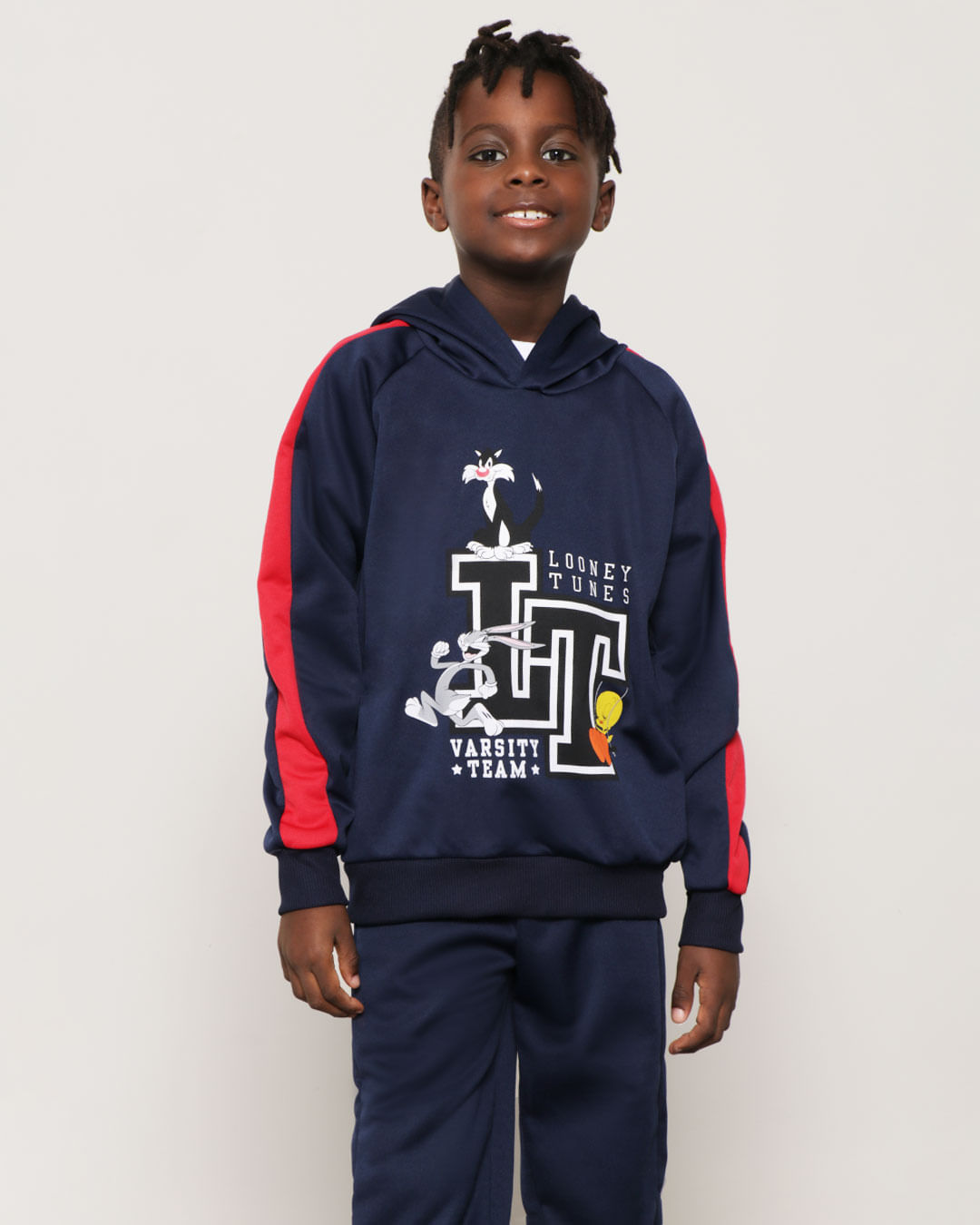 Blusão infantil confeccionado em tecido helanca flanelada. Possui capuz, manga longa com recorte na parte superior em tom contrastante e punho ribana, estampa frontal do personagem "Looney Tunes", barra ribana com acabamento e costura no tom.