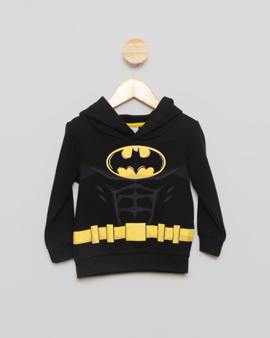 Blusão para bebês confeccionado em tecido de moletom. Possui capuz, manga longa. Punhos e barra com acabamento em ribana. A peça apresenta estampa frontal do personagem Batman. Acabamento e costura no tom.