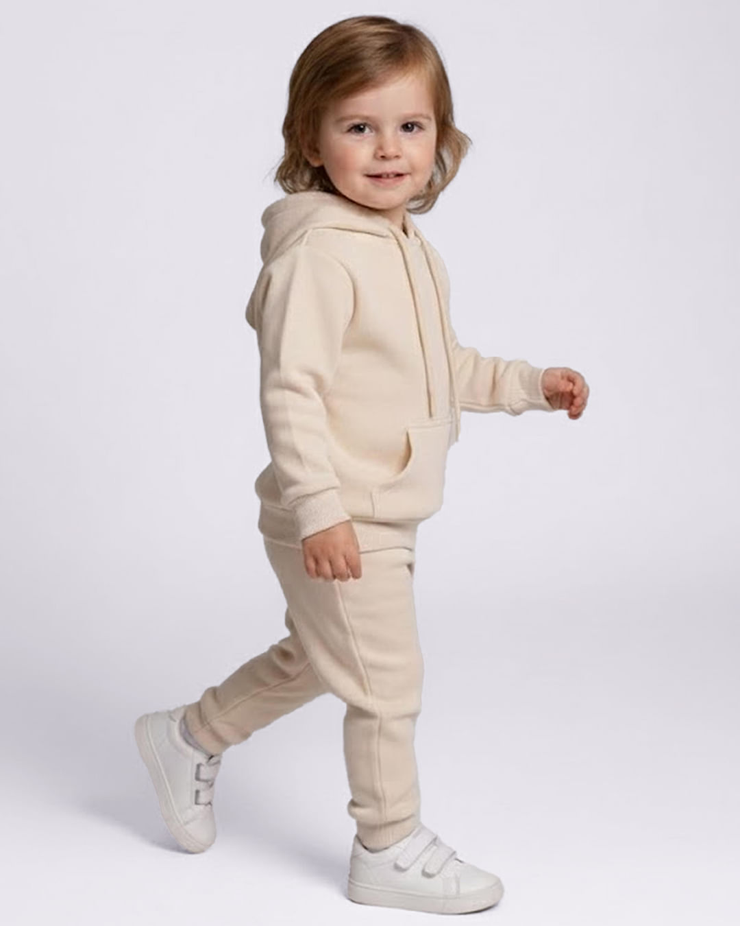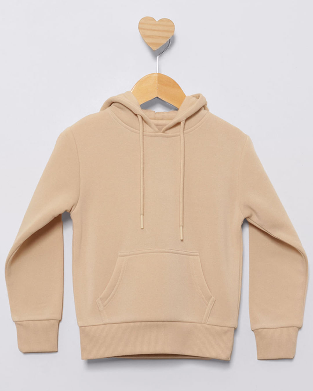 Blusão bebe confeccionado em tecido de moletom. Possui gola com capuz e cordão de ajuste, manga longa, bolso canguru, punhos e barra em ribana com costura e acabamento padrão.