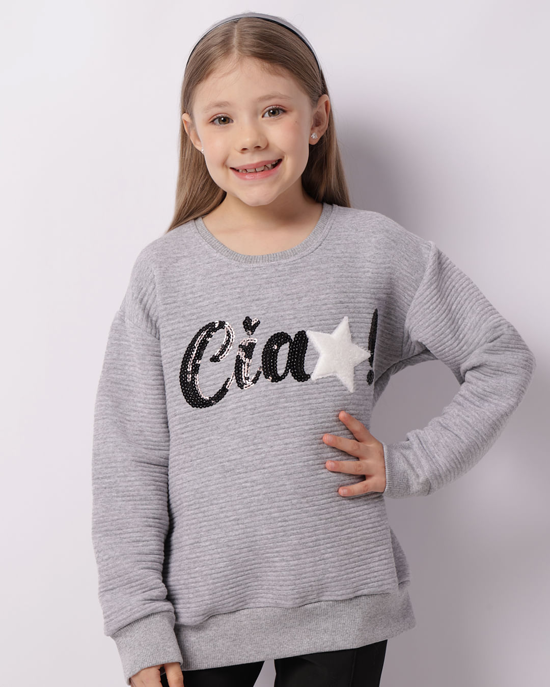 Mais detalhes: Blusão infantil confeccionada em moletom, texturizado, bordado frontal com paetê. Com costura e acabamento padrão.