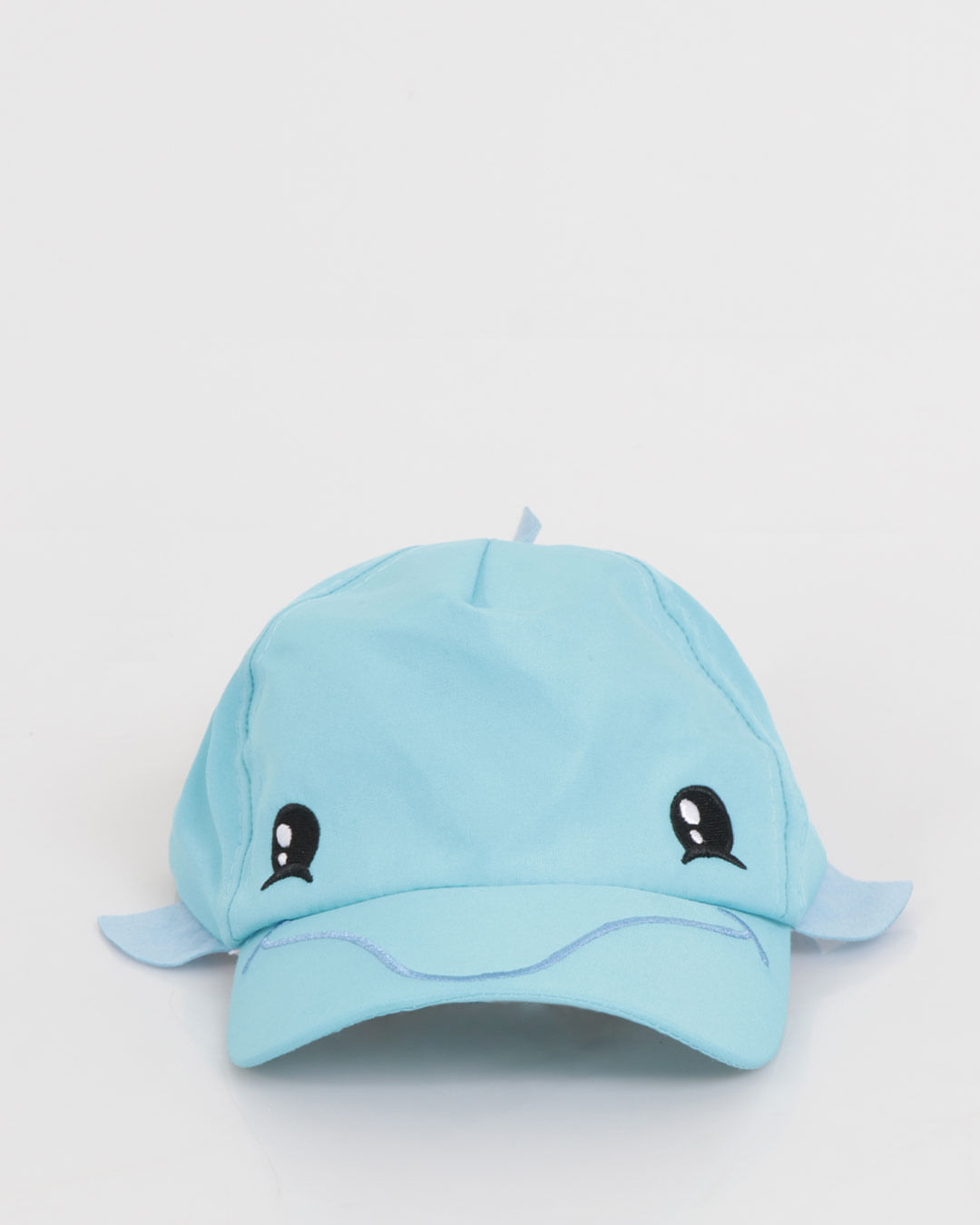Boné infantil confeccionado em poliéster. Possui aba curva em material sintético, estampa frontal golfinho com aplicação de barbatanas interativa. Ajuste posterior por velcro no modelo strapback e costura padrão.