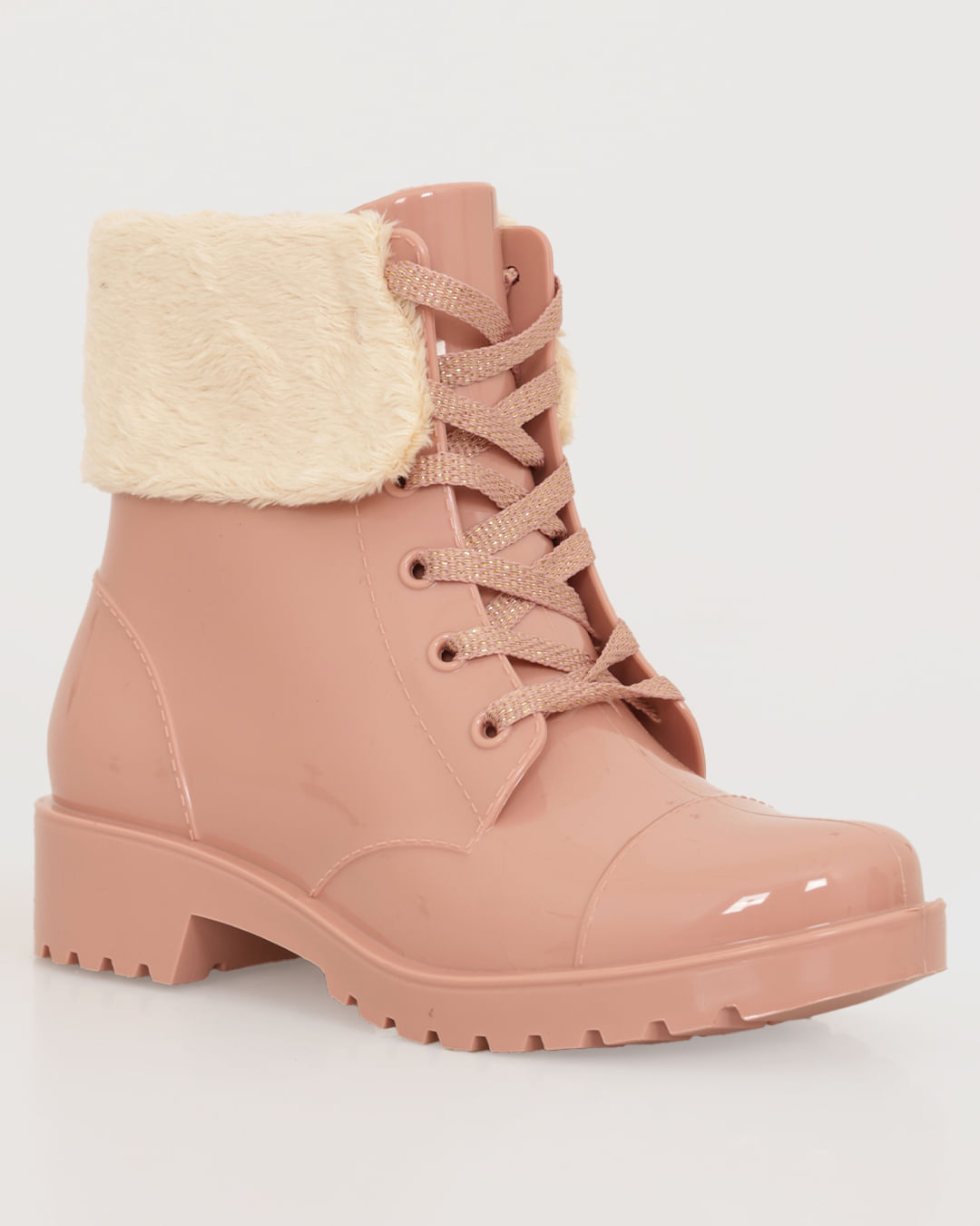 Bota bebê menina coturno cano médio, confeccionada em borracha. Possui cano com pelinhos, fechamento por cadarço brilhante, bico redondo, palmilha macia e removível, solado tratorado e emborrachado com frisos antiderrapante.