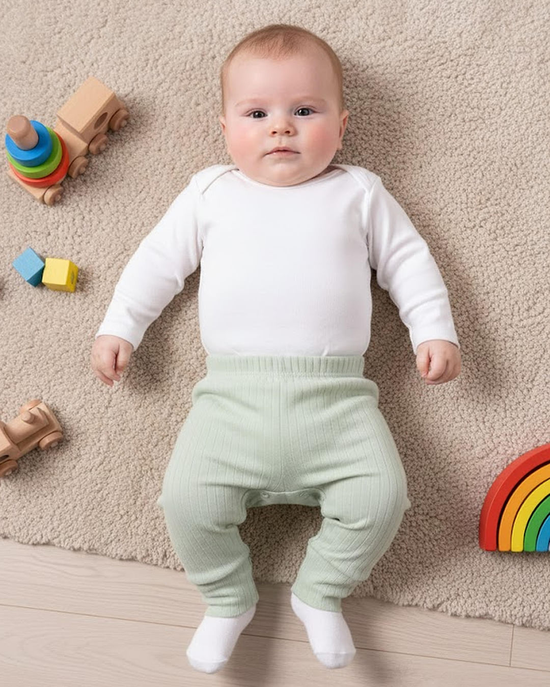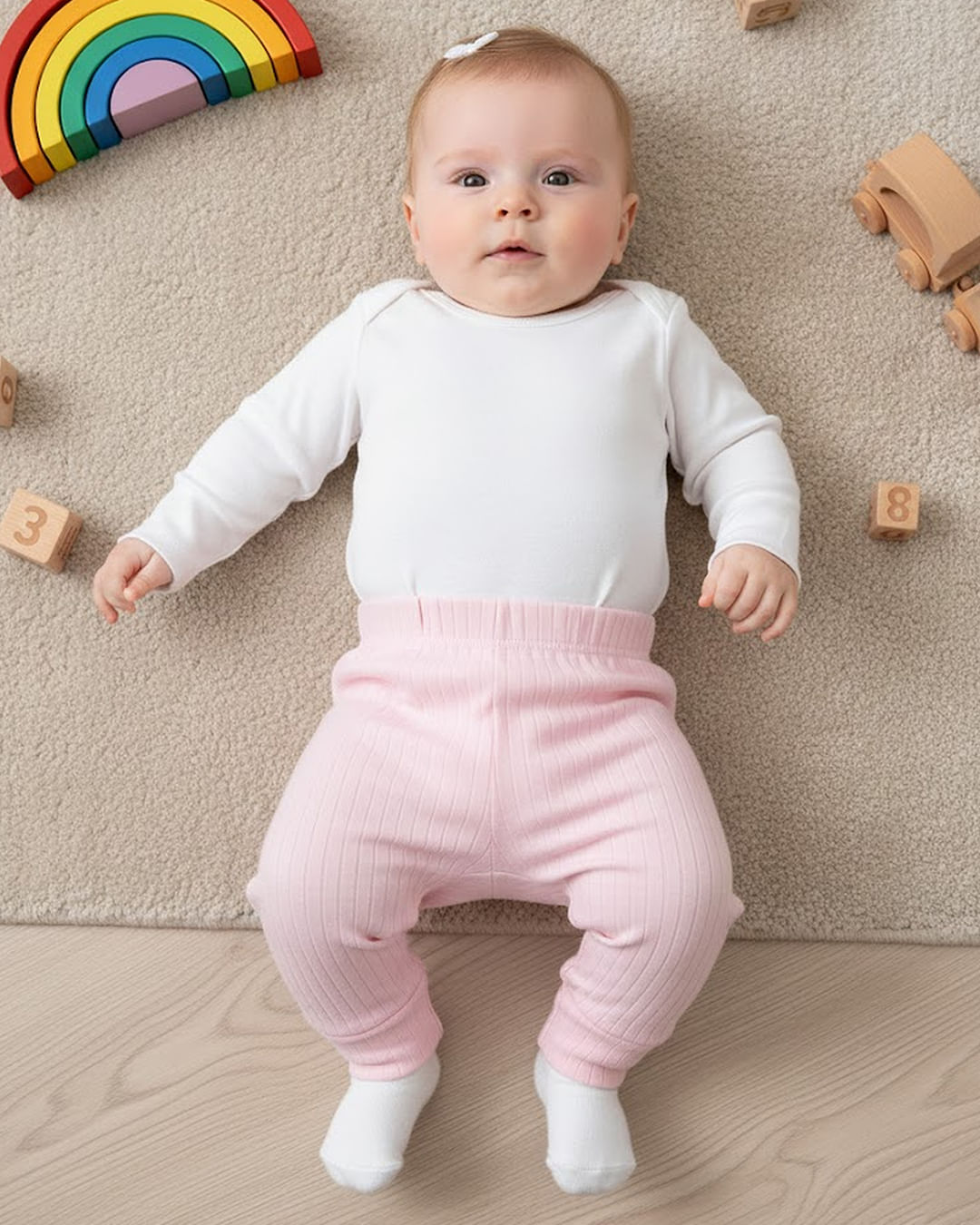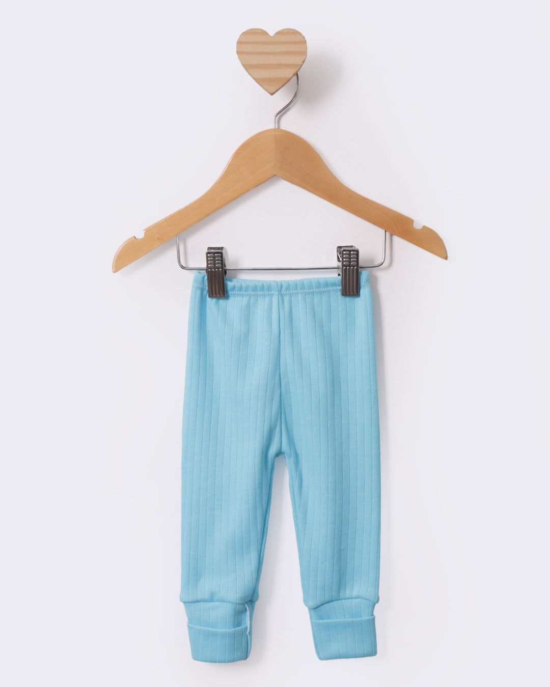 Calça bebê confeccionada em tecido em malha canelada. Possui cós com elástico, modelagem culote, vira pé, com costura e acabamento padrão.
