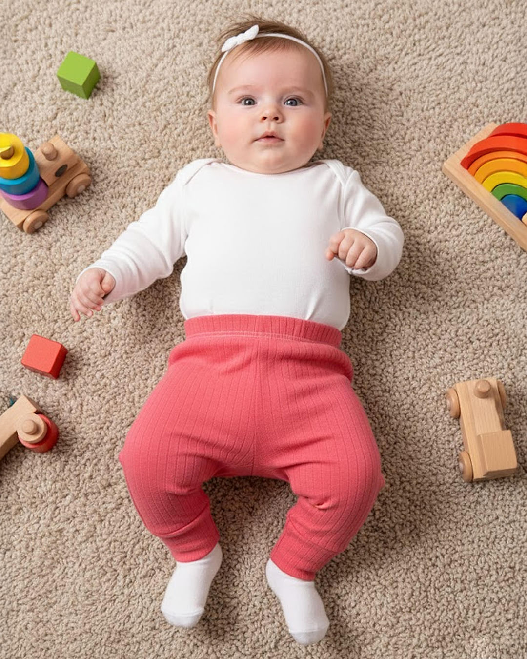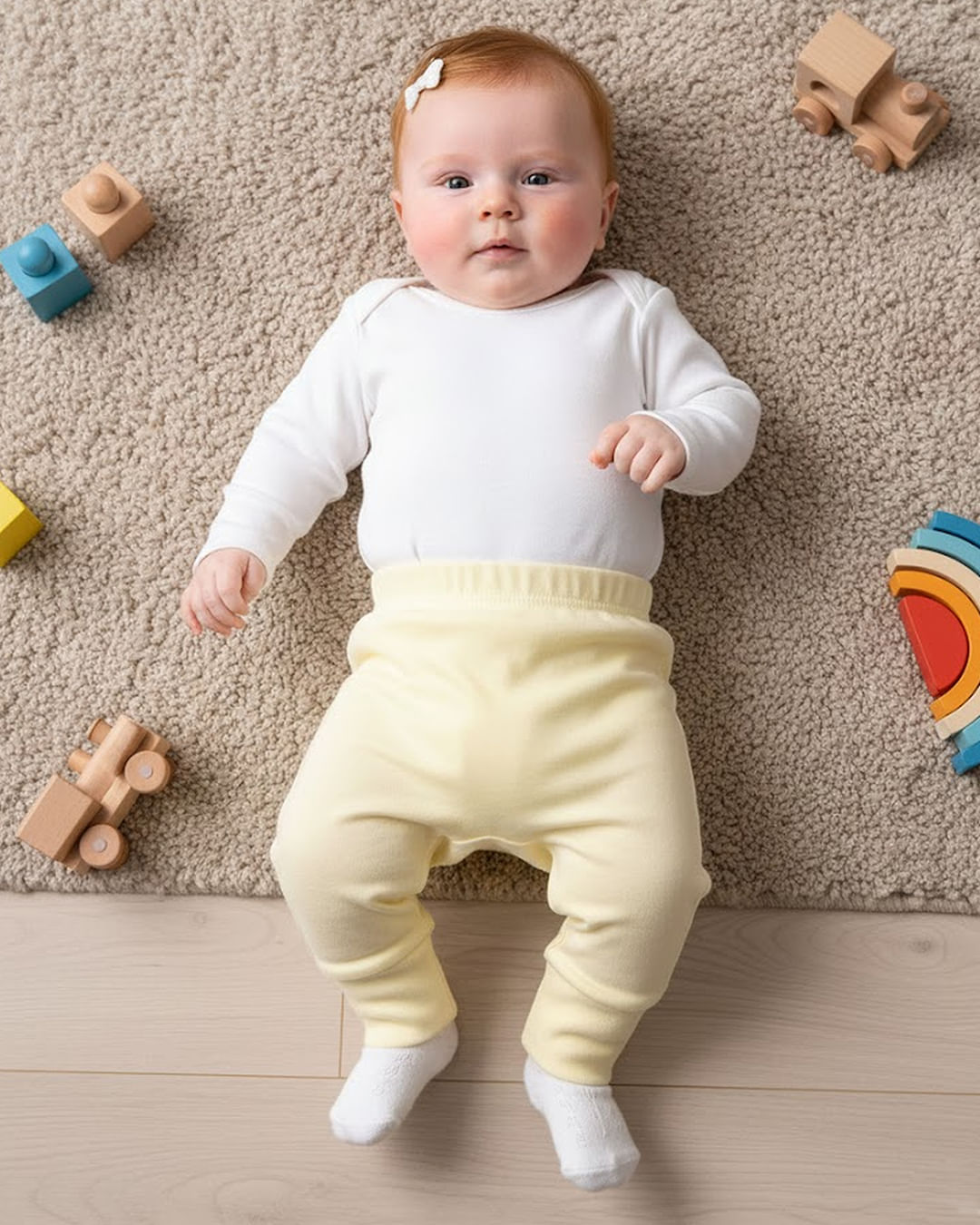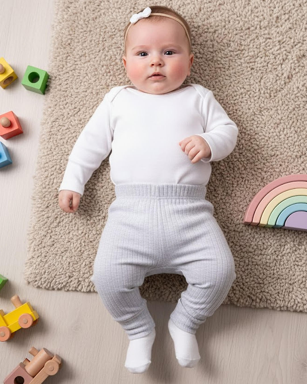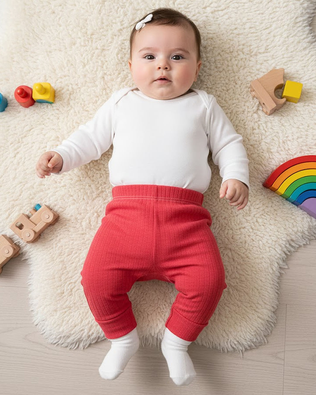 Calça bebê confeccionada em tecido em malha canelada. Possui cós com elástico, modelagem culote, vira pé, com costura e acabamento padrão.
