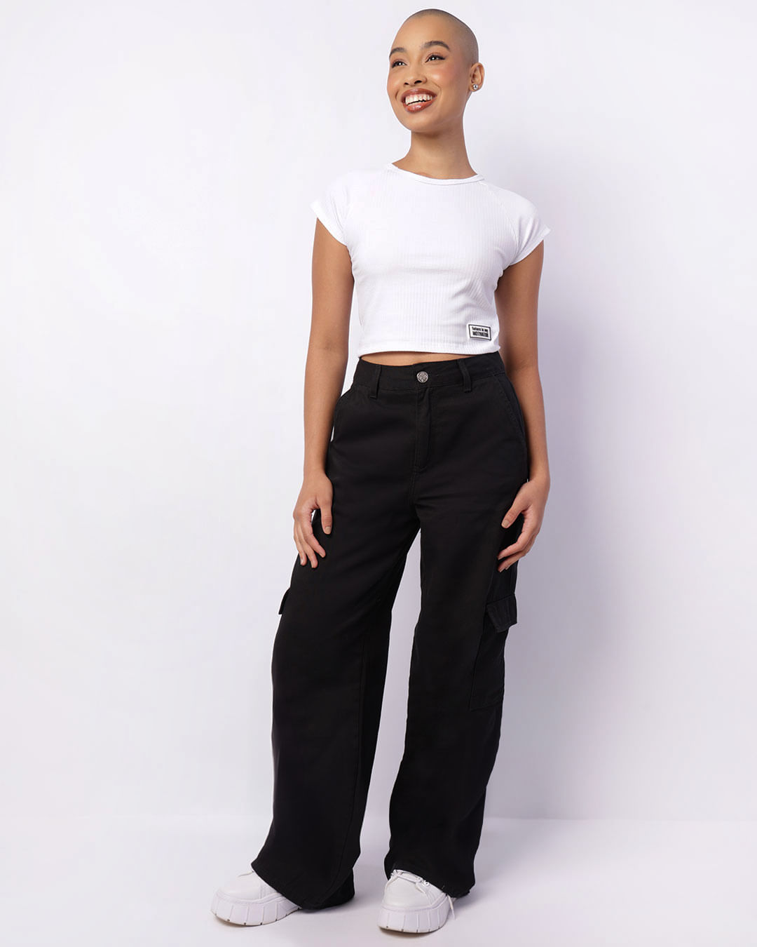 Calça feminina confeccionado em sarja, possui modelagem wide leg, cós regular com passantes, abertura por botão e zíper, bolsos frontais, posteriores e cargo e barra comum com costura pespontada no tom e acabamento padrão.