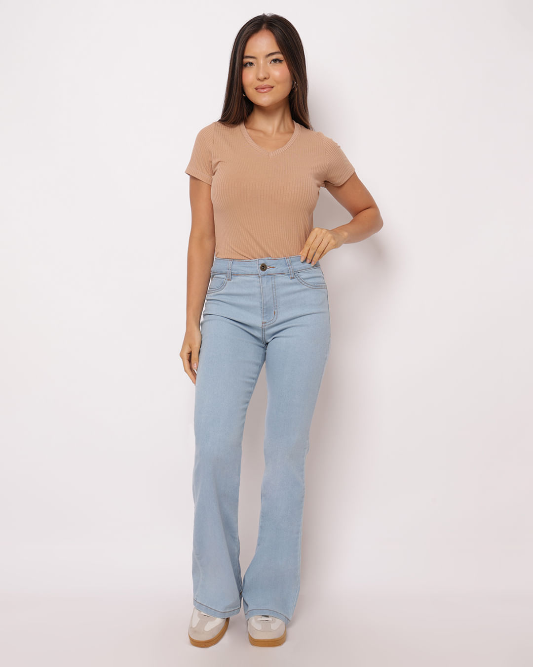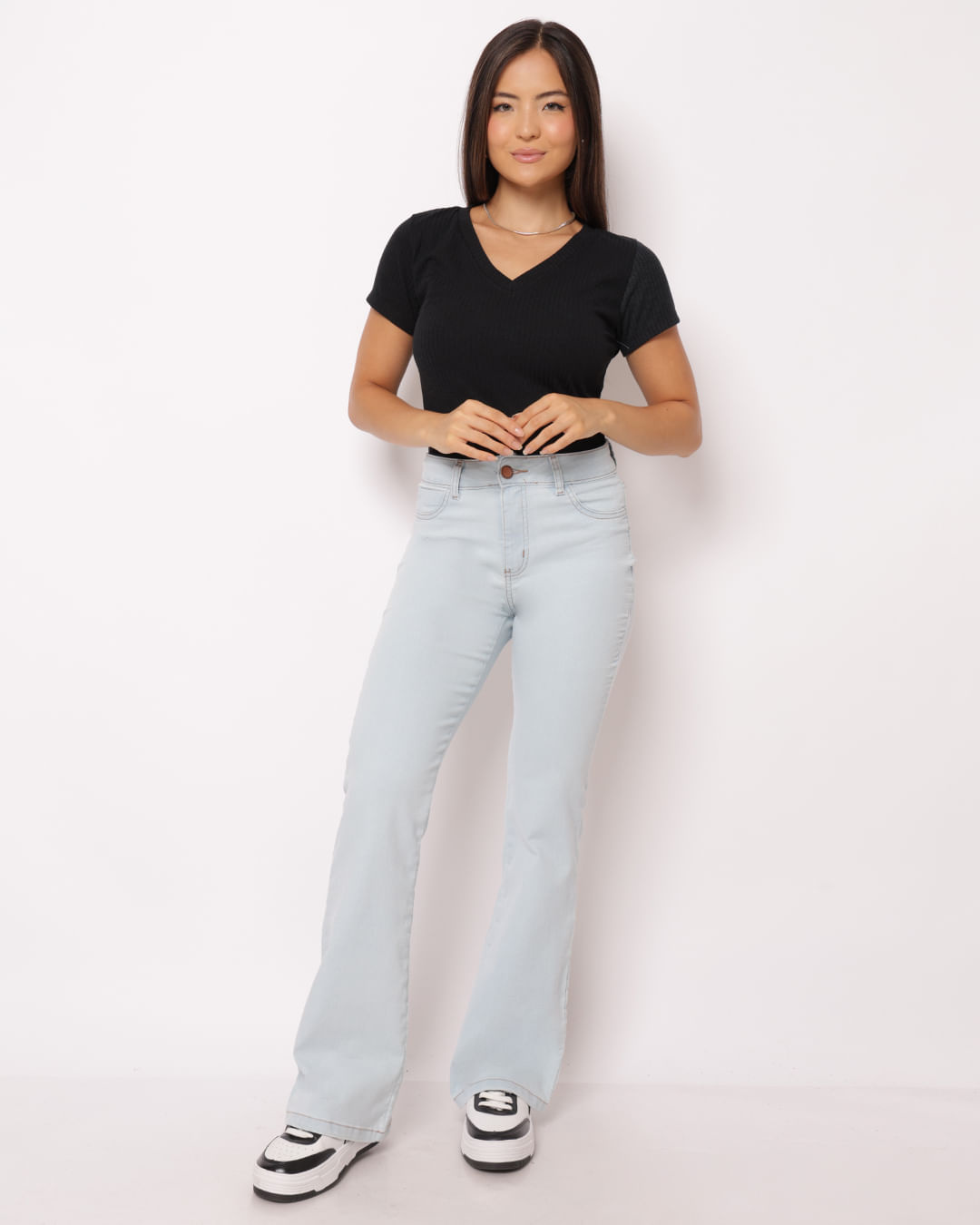 Calça feminina confeccionada em black jeans, possui modelagem flare, cós regular com passantes, bolsos frontais decorativos e posteriores com barra comum, peça encorpada com costura pespontada no tom e acabamento padrão.