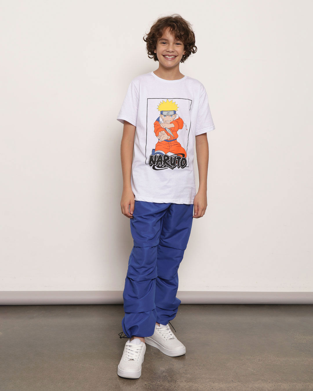 Calça juvenil confeccionada em tecido plano de secagem rápida e sem elasticidade. Possui modelagem parachute, cós com elástico regulável, barra com elástico ajustador, acabamento e costura padrão.