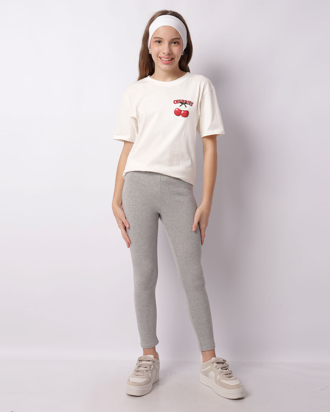Calça legging juvenil confeccionada em malha, possui cós regular com elástico, modelagem legging e barra comum, peça lisa com costura e acabamento padrão.