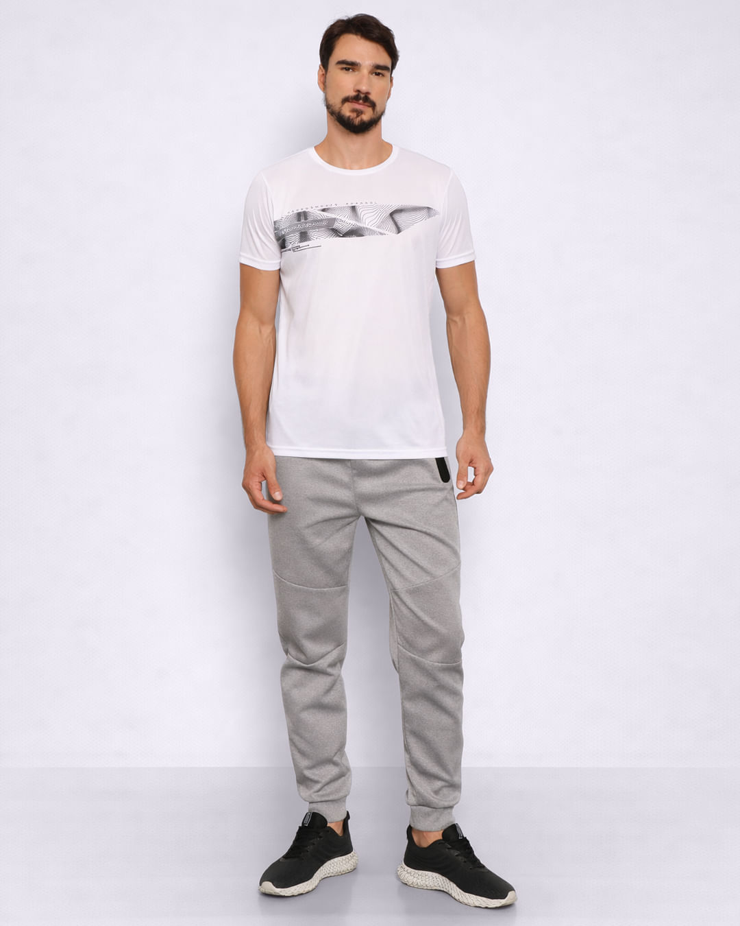 Calça masculina confeccionada em helanca. Possui cós com elástico e cordão para ajuste, bolsos frontais com fechamento por zíper com faixa refletiva, com recortes texturizados, modelagem jogger , acabamento e costura padrão.