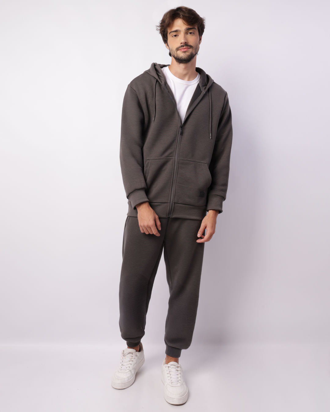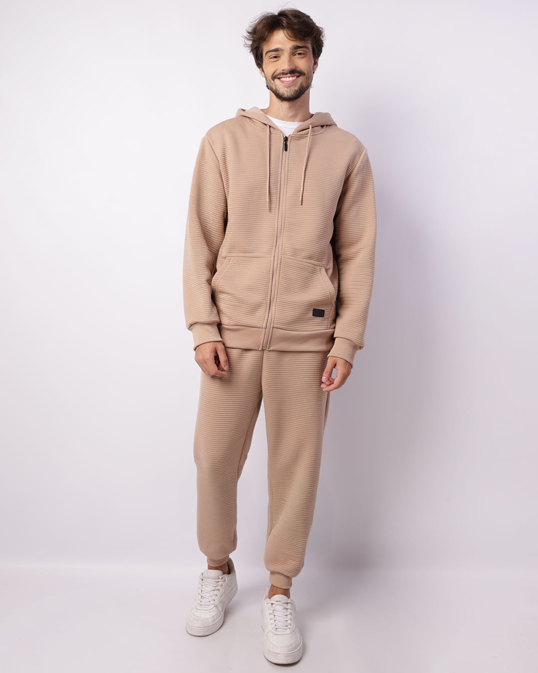 Mais detalhes: Calça masculina confeccionada em poliéster, possui modelagem jogger, cós regular com elástico e cordão de ajuste, bolsos frontais com zíper e barra comum, peça texturizada com costura e acabamento padrão.