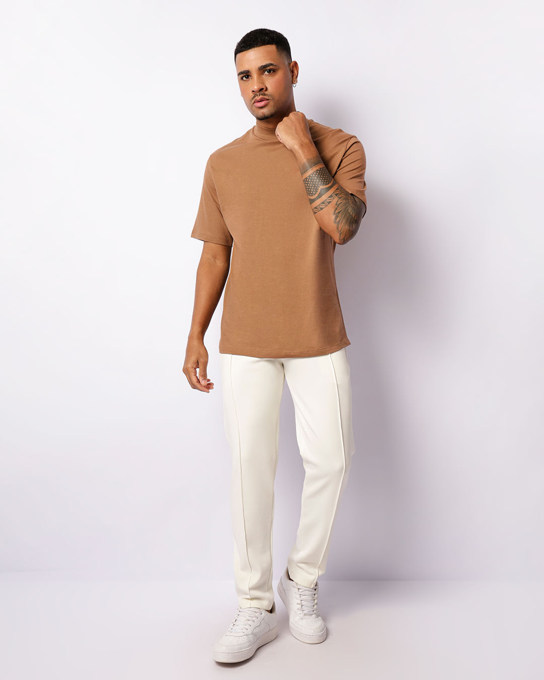Calça masculina confeccionada em helanca, possui cós regular com elastico e cordão de ajuste, bolsos frontais, modelagem reta e barra comum, peça com frisos frontais com costura e acabamento padrão.