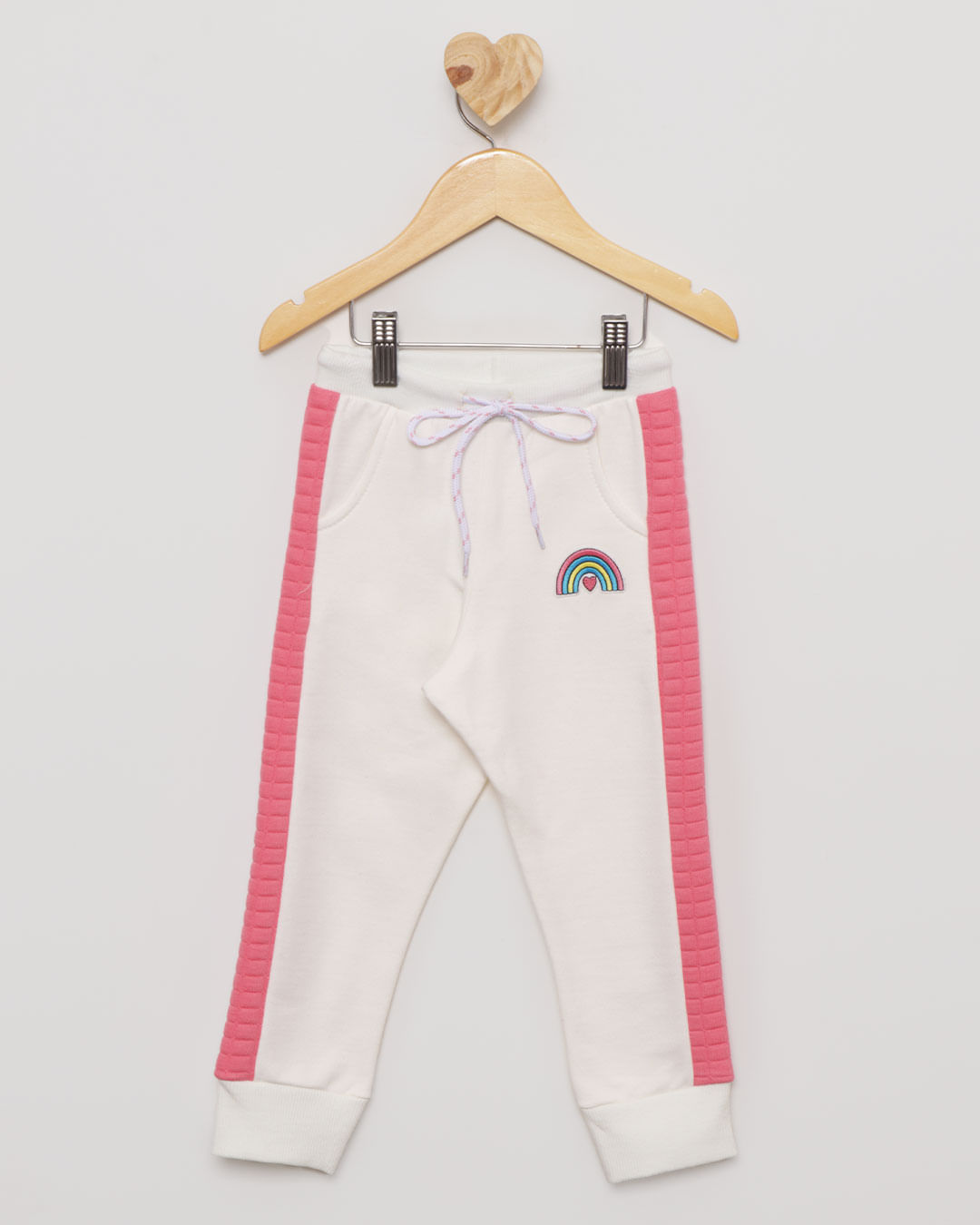 Calça confeccionada em moletom, ideal para crianças de 1 a 3 anos de idade. A peça tem recorte lateral com detalhe em matelasse. A modelagem é reta com caimento soltinho no corpo. O cós é com elástico e cordão para ajuste. A parte frontal tem bordado de arco iris. A barra tem acabamento em ribana.