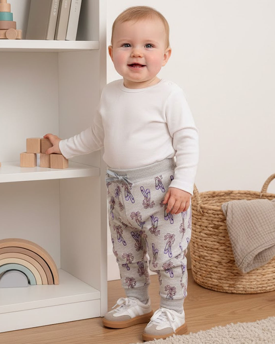 Produto OriginalMais detalhes: Calça bebê, confeccionada em moletom, cós com elástico e cordão decorativo, estampado com sapatilha "bailarina", acabamento interno felpado, com costura e acabamento padrão