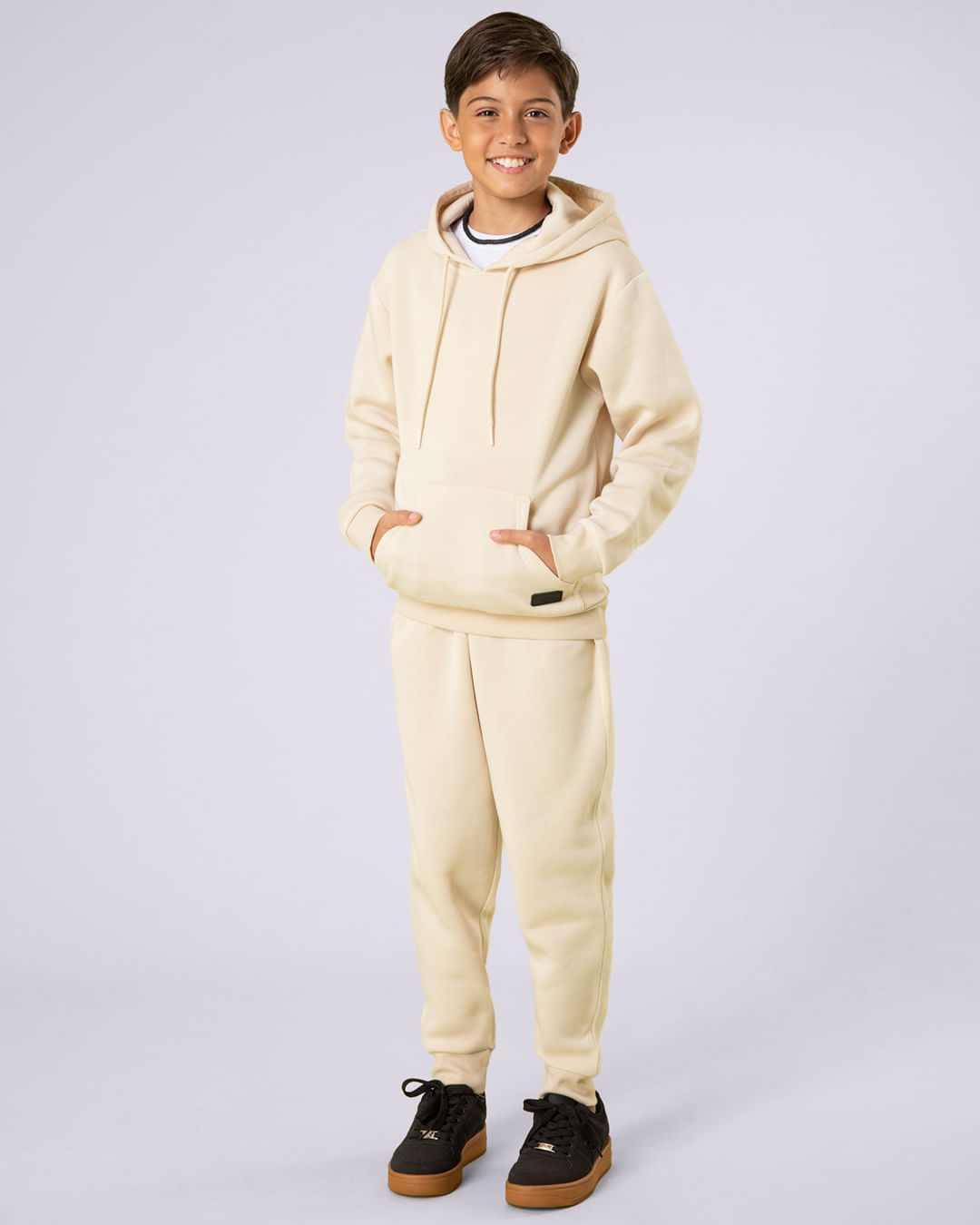 Moletom juvenil, confeccionado em poliéster, cós e barra com elástico, cordão ajustável no cós, bolsos frontais e um bolso posterior acabamento interno felpudo, modelagem jogger, com costura e acabamento padrão.