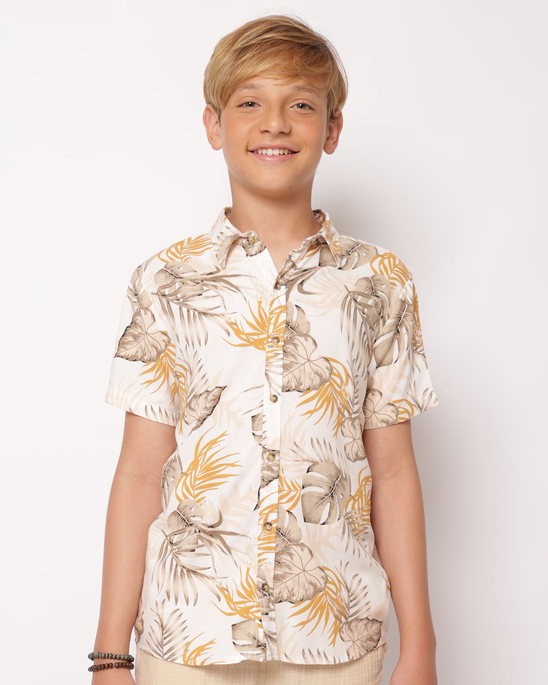 Camisa juvenil confeccionada em Viscose. Possui gola dobrável, fechamento por botões, estampa tropical, acabamento e costura padrão.