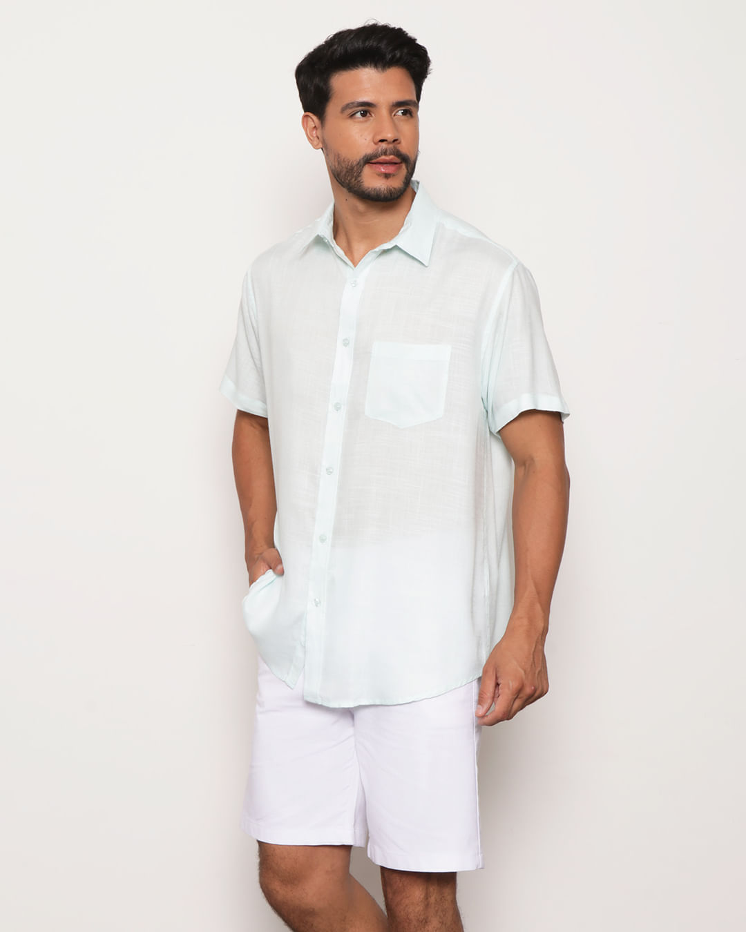 Camisa masculina confeccionada em tecido poliéster aspecto de linho. Possui gola tradicional, manga curta botões no punho, bolso unico na parte frontal, barra levemente arredondada acabamento e costura padrão.