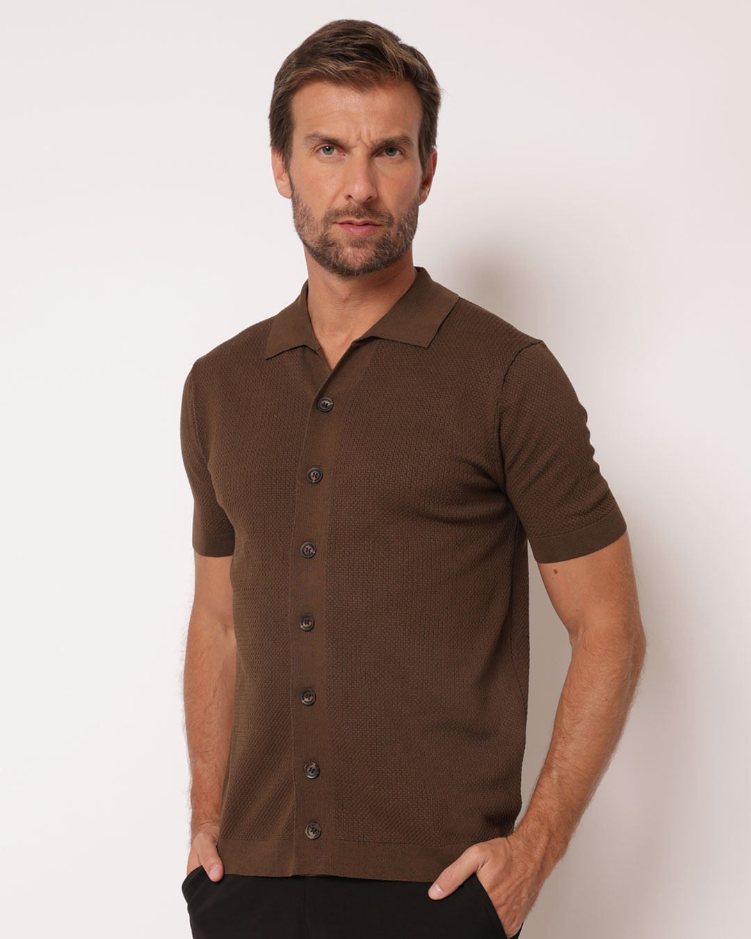 Mais detalhes: A camisa masculina apresenta modelagem clássica com manga curta e fechamento frontal por botões, trazendo um visual moderno e sofisticado. O tecido possui textura sutil, que adiciona profundidade e elegância à peça, sem perder a leveza e o conforto. A gola estilo colarinho aberto reforça o aspecto contemporâneo, garantindo um caimento alinhado e perfeito para compor looks casuais ou arrumados. Versátil, a camisa pode ser usada aberta com camiseta por baixo ou sozinha para um visual minimalista. Ideal para dias quentes, oferece respirabilidade e estilo em uma única peça, combinando facilmente com calças, bermudas e jeans.