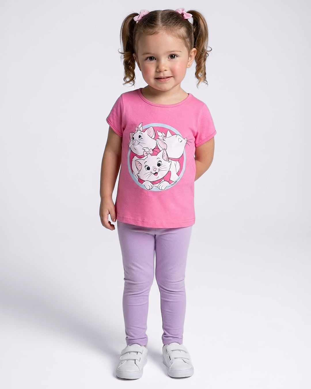 Mais detalhes: Camiseta bebê Disney Marie, confeccionada em algodão, decote redondo, manga curta, estampa frontal Marie e personagens, com costura e acabamento padrão.