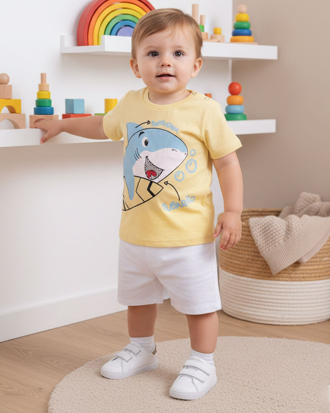 Camiseta bebê menino, manga curta com estampa interativa frontal de tubarão com prancha.