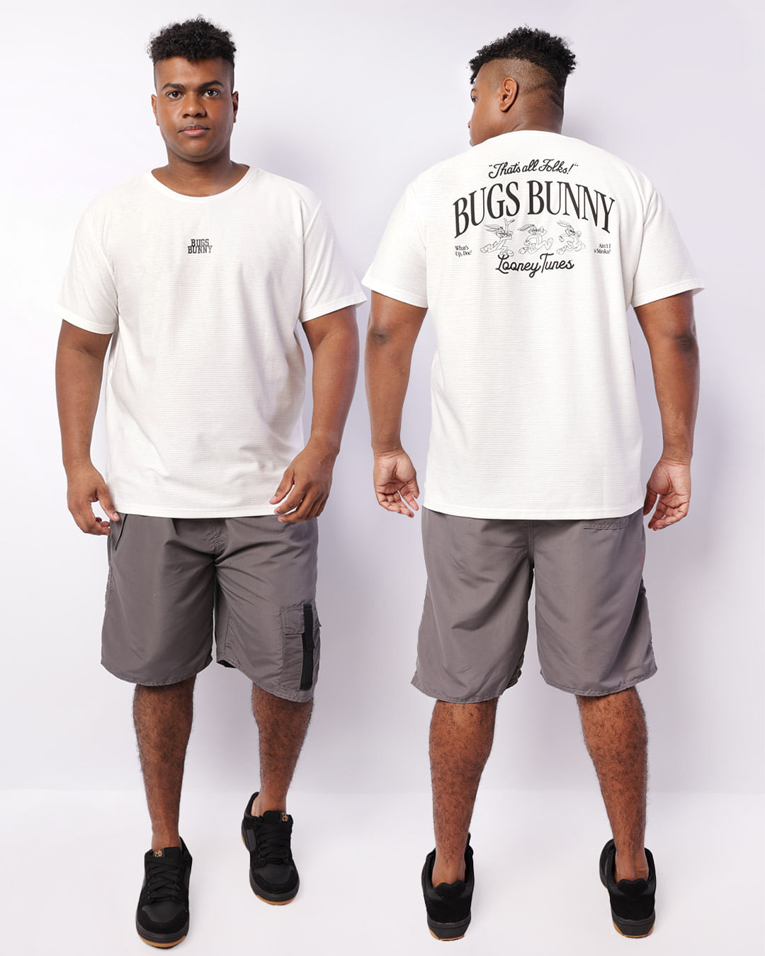 Detalhes: Aplicação frontal com escrita: Bugs Bunny e na parte posterior os personagens