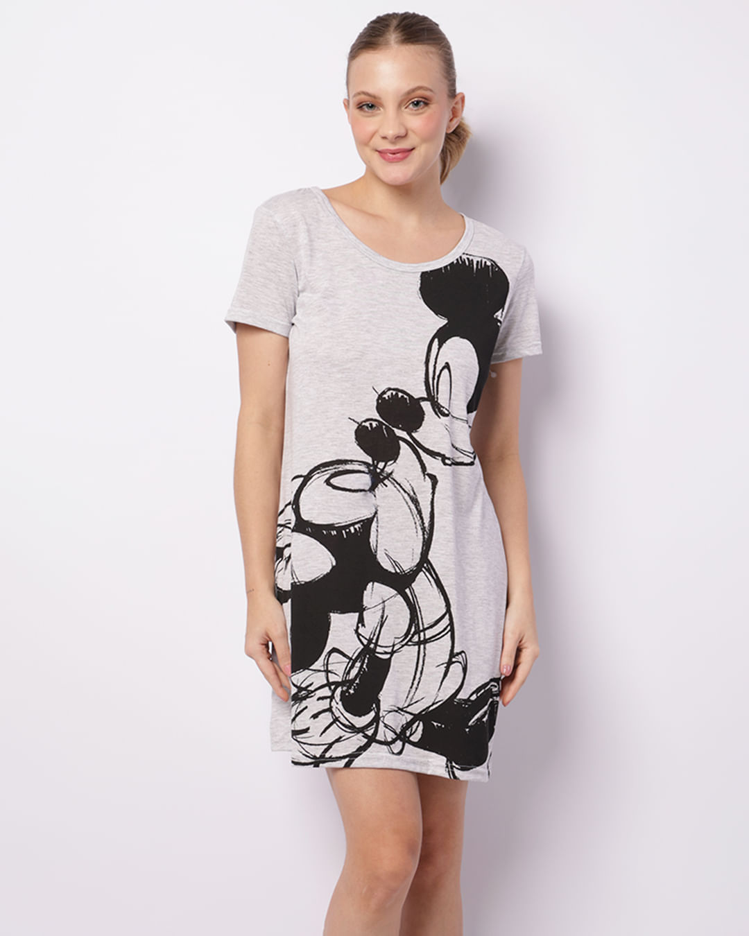 Camisola feminina confeccionada em malha. Possui modelagem curta, manga curta, decote redondo, estampada personagem Mickey e Minnie, acabamento e costura padrão.