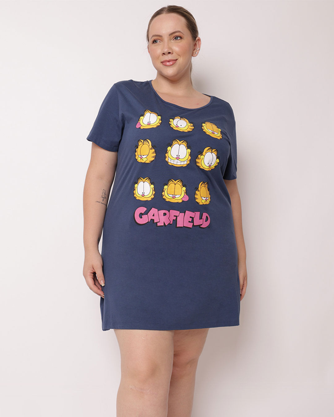 Mais detalhes: Camisola plus size feminina, confeccionada em tecido p100%Algodão. Modelagem curta. Possui decote redondo e manga curta, estampa do personagem Garfield. Com costura e acabamento padrão.