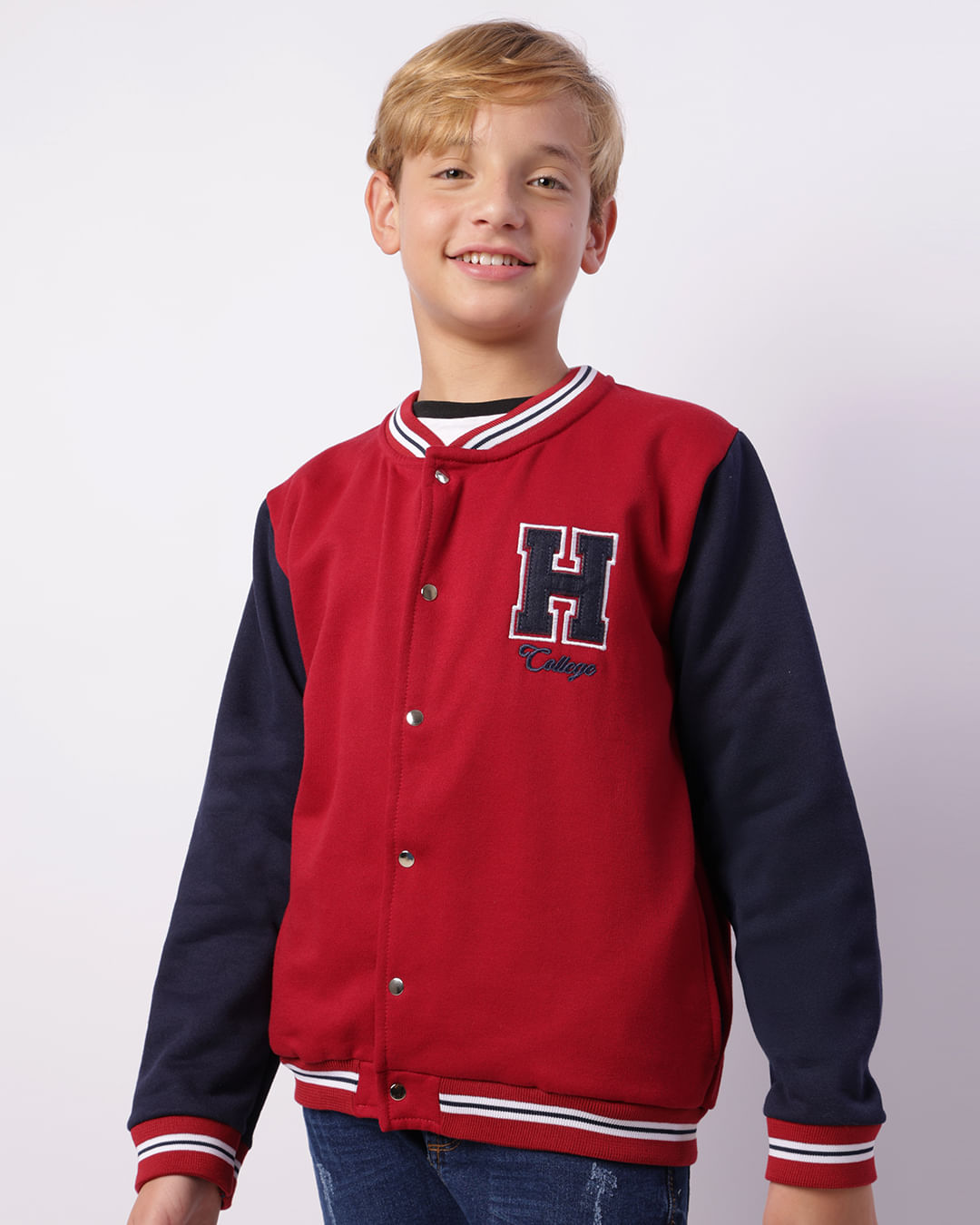 Mais detalhes: Casaco juvenil, confeccionado em moletom. Parte interna felpado, gola careca, recorte frontal com estampa college escrita, manga longa na cor marinho. Com costura e acabamento padrão.
