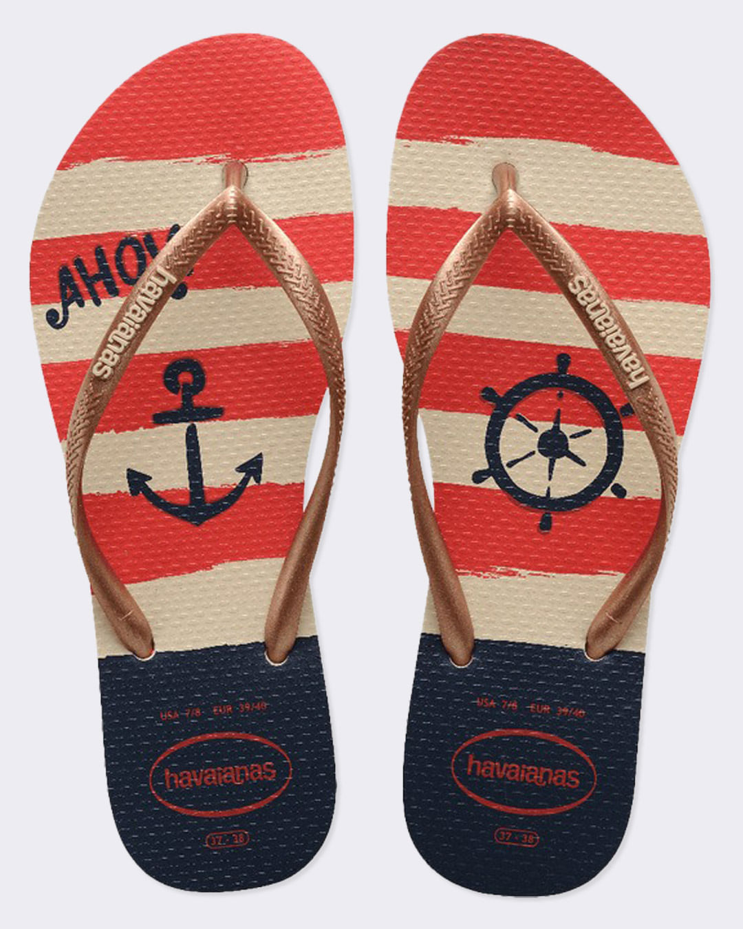 A Havaianas Top Nautical traz todo o charme do estilo náutico com releituras de vários listrados. Seja em azul, branco e vermelho ou em listras com um veleiro no mix, esse chinelo é uma ótima escolha para quem é do mar.