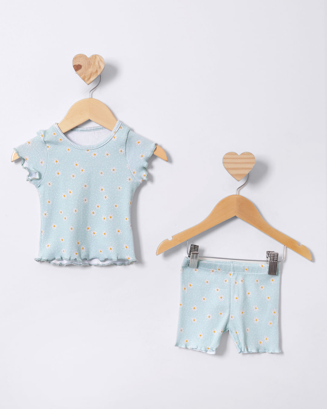 Conjunto infantil confeccionado em tecido de malha canelada. Possui blusa com gola redonda, manga curta e estampada de florzinhas. Acompanha short curto com barra simples, estampado, com costura e acabamento padrão.