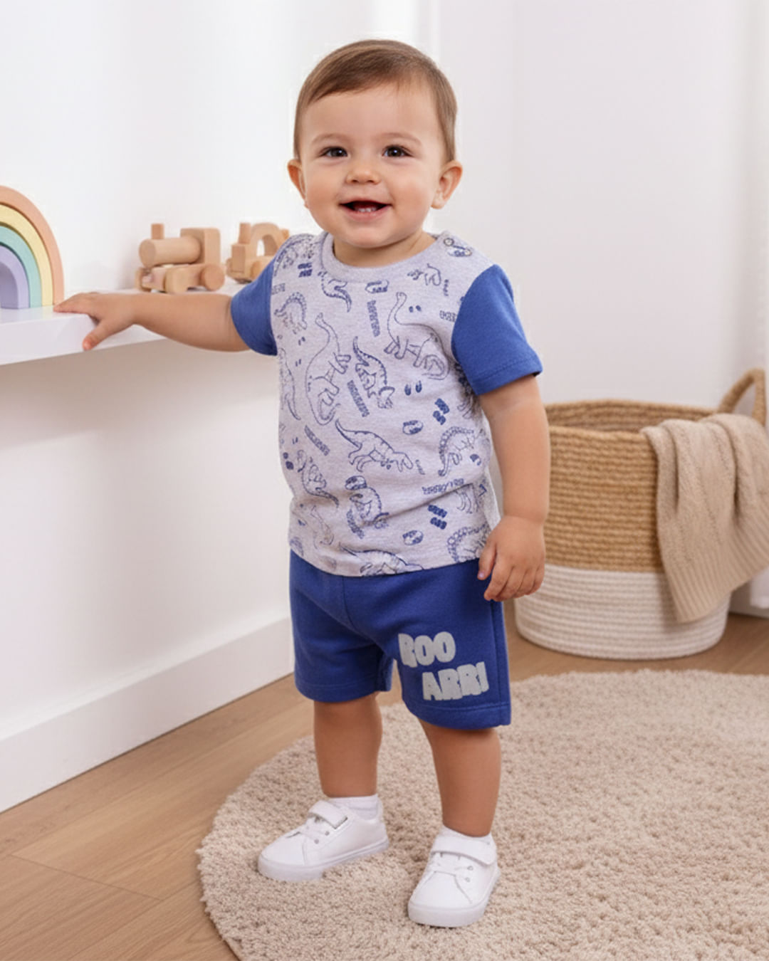 Conjunto bebê confeccionado em moletinho. Possui camiseta manga curta, gola redonda, estampa de dinossauros. Acompanha bermuda moletinho na cor verde, cós com elástico, barra e acabamentos e costura padrão.