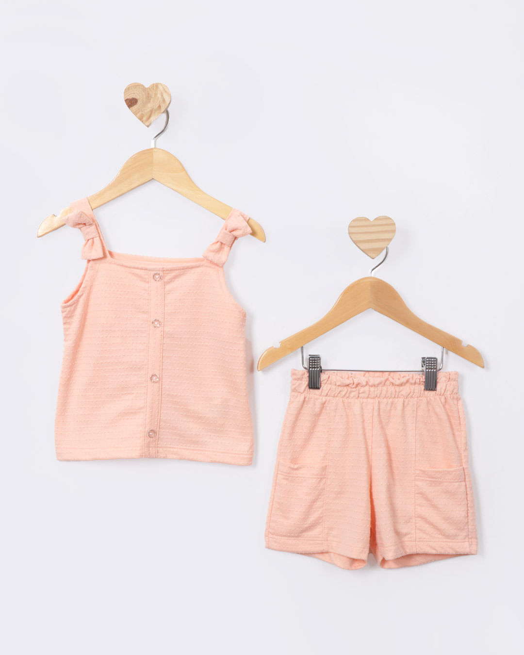 Conjunto bebê confeccionado em tecido de malha texturizada, Possui blusa gola rete, alças com lacinho decorativo, botões frontais decorativo. Acompanha short curto com elasticidade, bolsos laterais, barra simples com costura e acabamento padrão.
