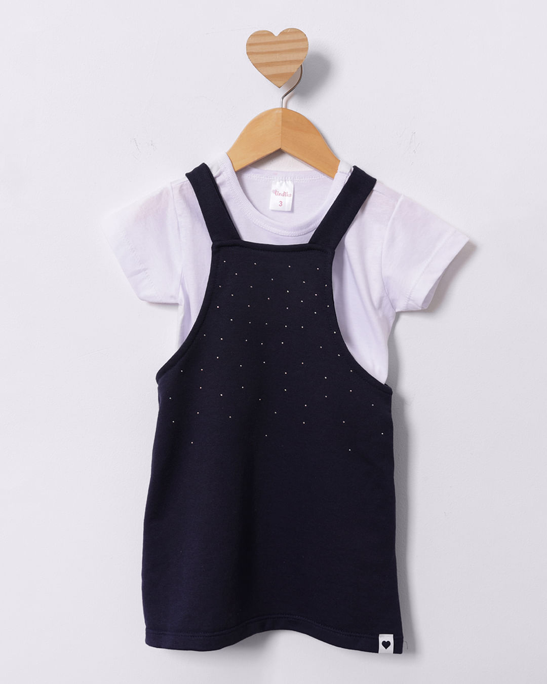 Mais detalhes: Conjunto bebê, confeccionado em moletinho. Modelagem curta. Salopete decote reto com aplicação de strass na parte frontal, acompanha camiseta cropped básica, com decote redondo e manga curta. Com costura e acabamento padrão.