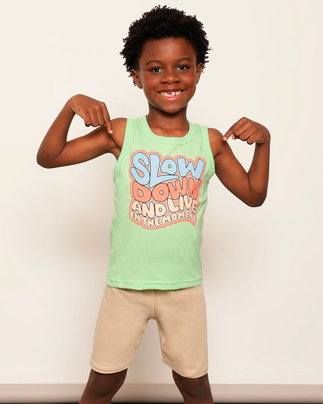 Conjunto infantil confeccionado em tecido Algodão. Possui regata cava sem manga, com gola redonda, estampa frontal com escrita. Acompanha bermuda modelagem reta, cós com elástico, com costura e acabamento padrão.