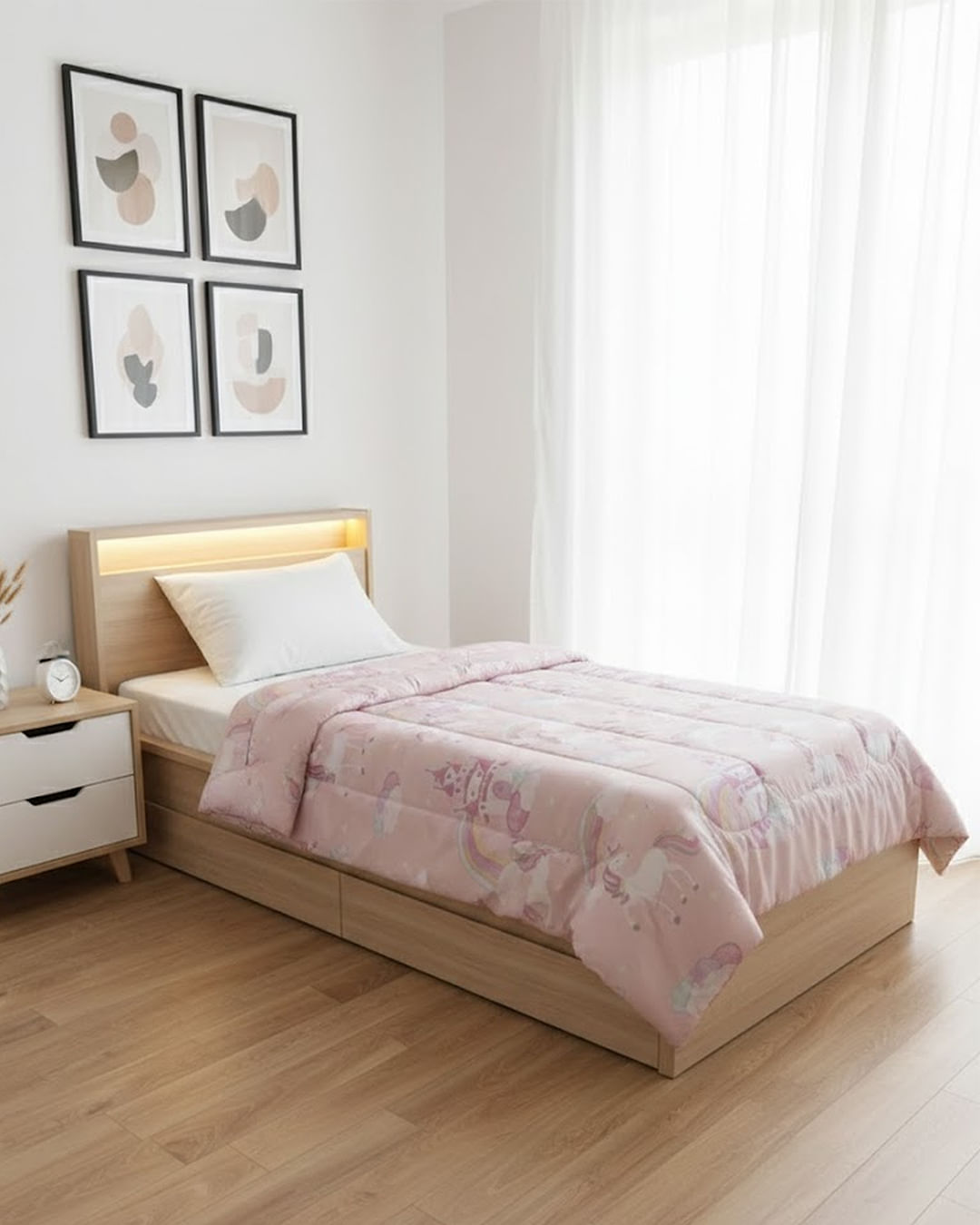 Edredom solteiro infantil confeccionado em microfibra. Possui dupla face acolchoada, com estampa de unicórnios e castelos. A peça tem 150 fios e o toque é macio com costura e acabamento padrão. Aproveite!